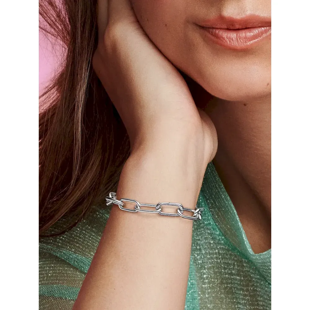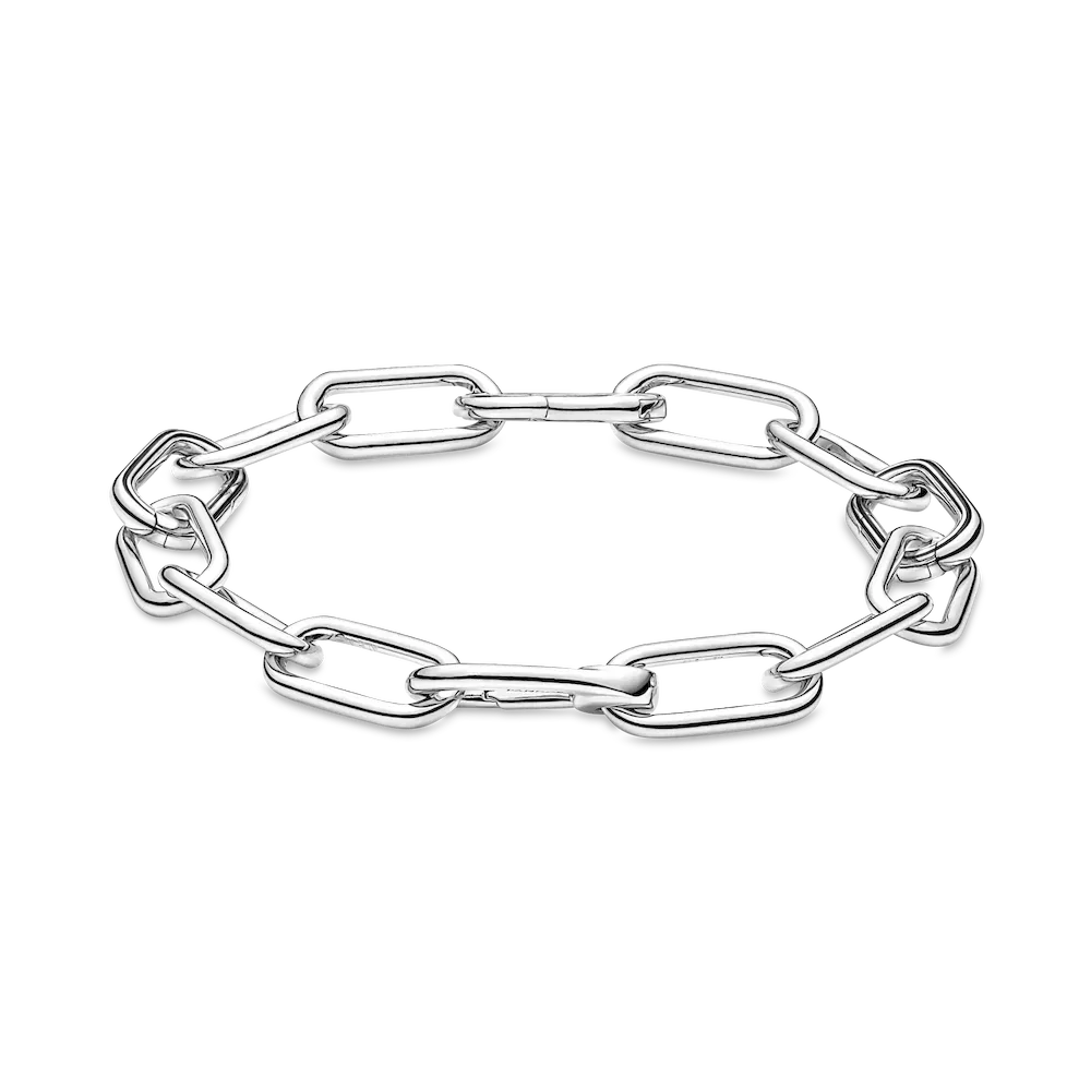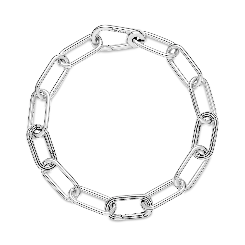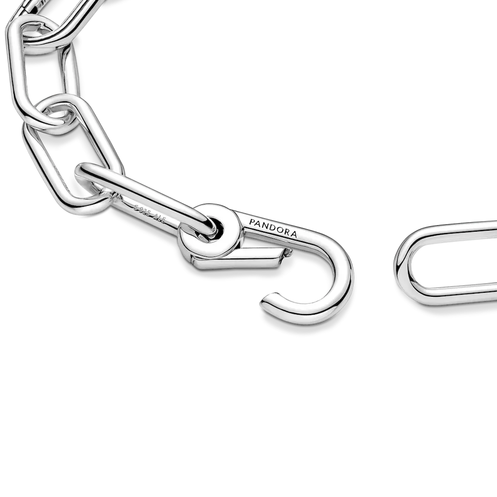 Wear your mantra on your wrist. Our sterling silver Pandora ME Medium-Link Chain Bracelet holds endless styling possibilities. The bracelet features three openable links, designed with a grooved surface to set them apart, styling links and a carabiner clasp closure. First customise your link chain: one set of interlocking styling links can be swapped out between each openable link for four small interlocking links, a styling double link or one styling link – keep the original length or adjust it to suit you. Once you’ve curated your link chains, remix your look with up to two meaningful medallion charms or up to eight mini dangle charms on each openable link, or with one medallion charm per styling link to show the world what you’re about. Please note this item is only compatible with Pandora ME jewelry and will not fit our other collections.