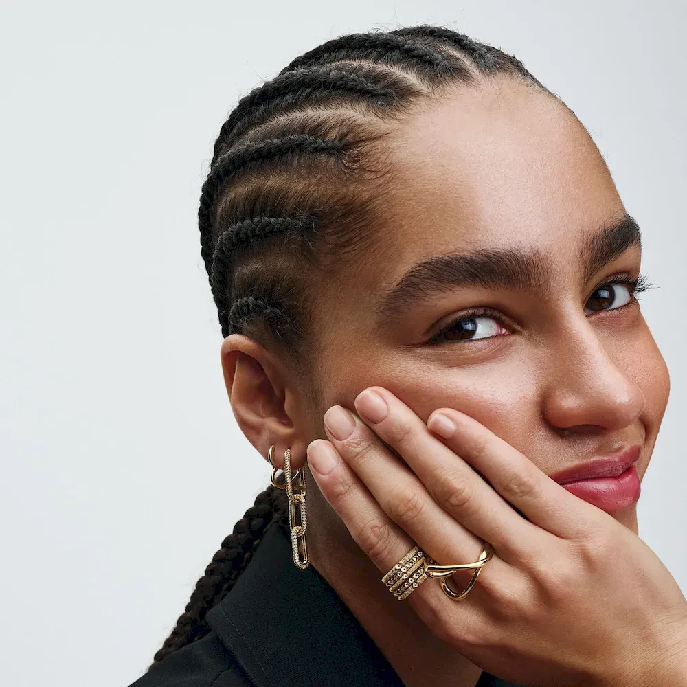 Give your chains a golden glow up with this Pandora ME Pavé Double Styling Link. Made up of two interlocking links set with two rows of round brilliant-cut clear cubic zirconia, each is hand-finished in 14k gold-plated unique metal blend. Style between openable links on your Pandora ME link chain bracelets or necklaces, or hang on a pair of hoops for a unique statement. Styling tip: the length of a double link matches the length of two regular links, four small interlocking links or one styling link – for easy personalisation.