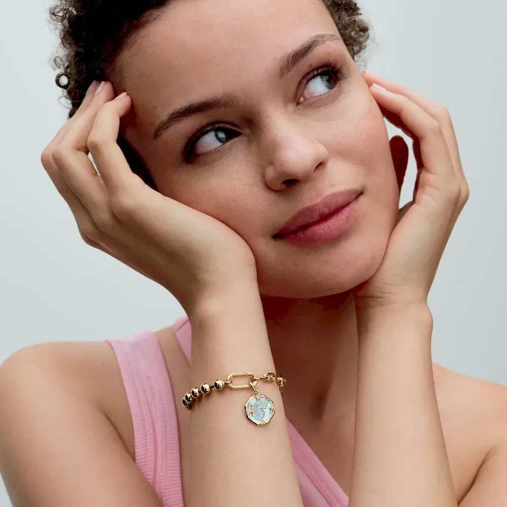 Wear a symbol of excitement with the Pandora ME Pearlescent Butterfly Medallion Charm. An octagon-shaped 14k gold-plated medallion frames a center disc of white bioresin man-made mother of pearl featuring laser engraved butterfly silhouettes. The octagonal frame has overlapping triangular details that feature sparkling stones on one side, one of which is part of a line of stones forming a butterfly’s body. Choose this butterfly charm as a reminder to embrace new experiences. Can only be styled on openable links.