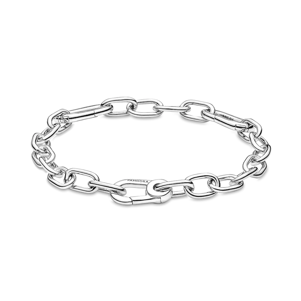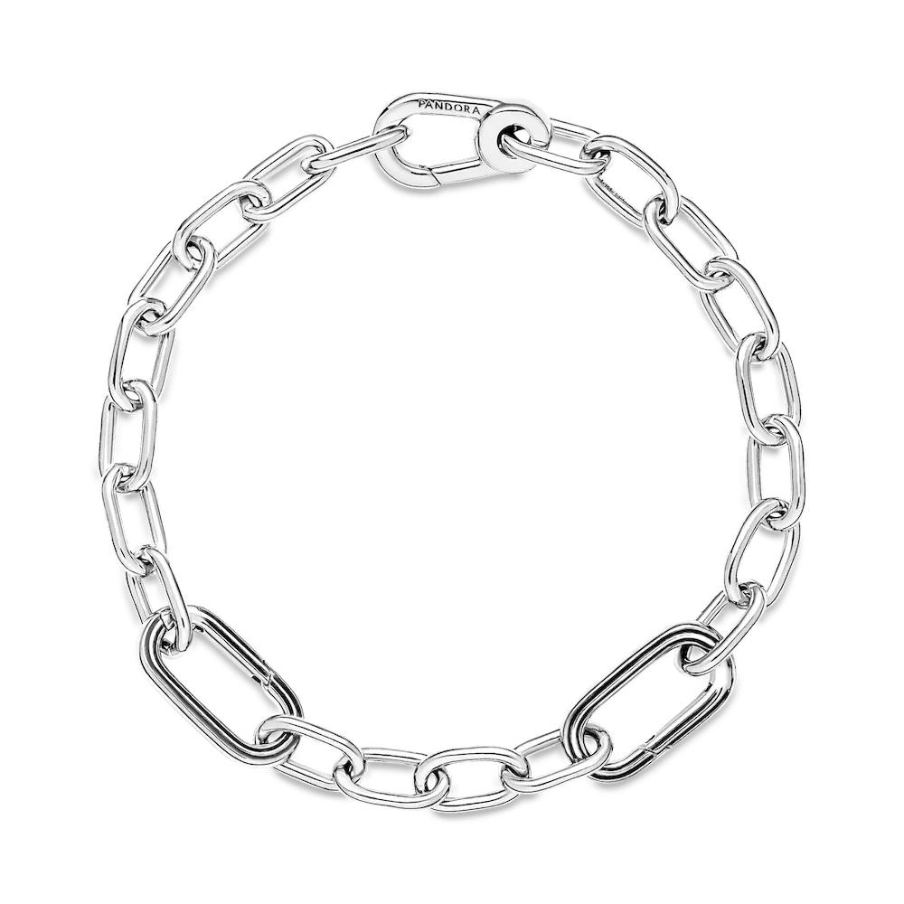 Link what you love like never before. Our sterling silver Pandora ME Small-Link Chain Bracelet holds endless styling possibilities. The design features two openable links – designed with grooved surfaces to set them apart – a group of four links between each openable link and a carabiner clasp closure. First customize your link chain: four links can be swapped out for one styling double link or one styling link – keep the original length or adjust it to suit you. Once you’ve customized your link chain, remix it with meaningful medallion charms and the mini dangle charms on the openable links to tell your story.