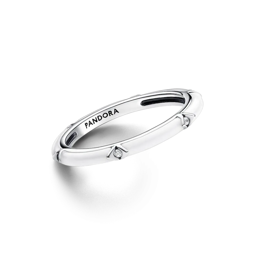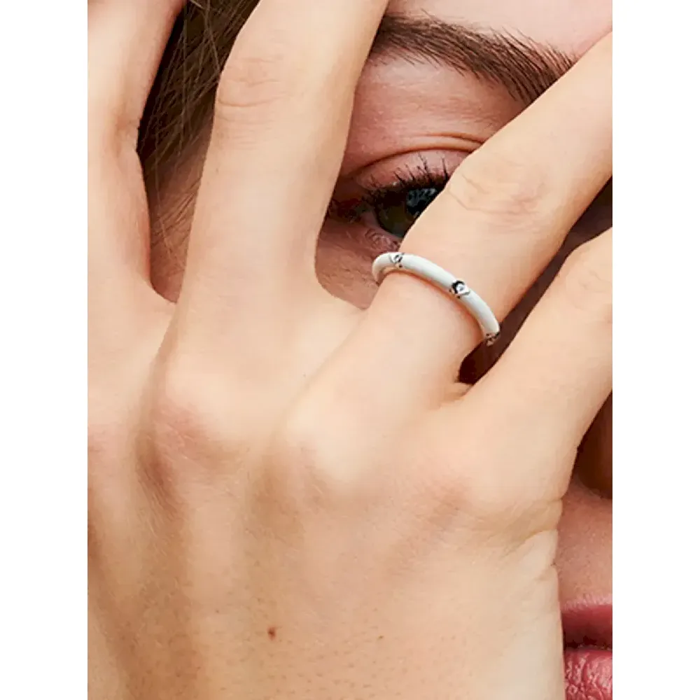 Add impact to your look with the Pandora ME Stones & Enamel Ring. This sterling silver ring features shiny white enamel punctuated by reverse pyramid-shaped indents set with sparkling stones. Pair it with other Pandora ME rings in different textures and enamel colors to create your own custom stack.