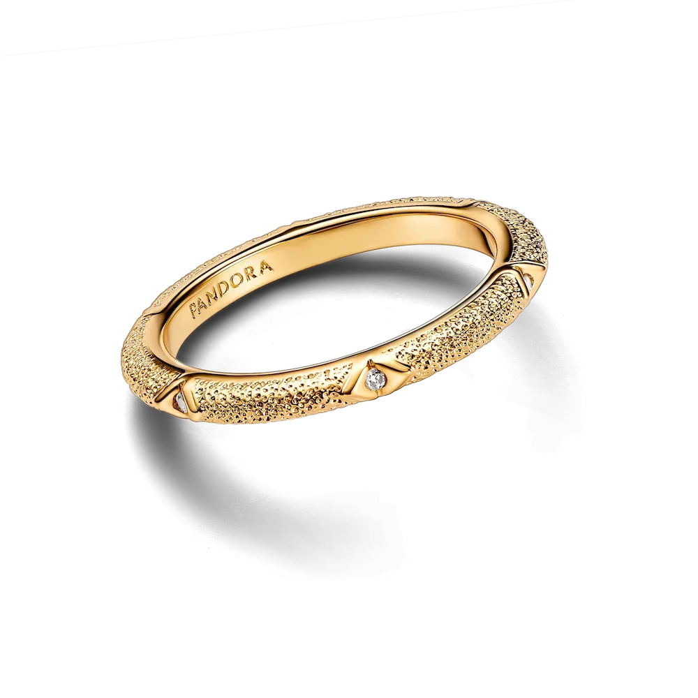 It’s all in the details with the Pandora ME Texture & Stones Ring. A 14k gold-plated band with a D-shaped profile is punctuated by six triangular punctures, each featuring a stone sparkling from within the tiny crevice. The rest of the ring’s band is embellished with a textured pattern. Inspired by the appearance of sand and the pattern of glistening sun on the ocean, this delicate, detailed ring is a subtle way to make a statement.