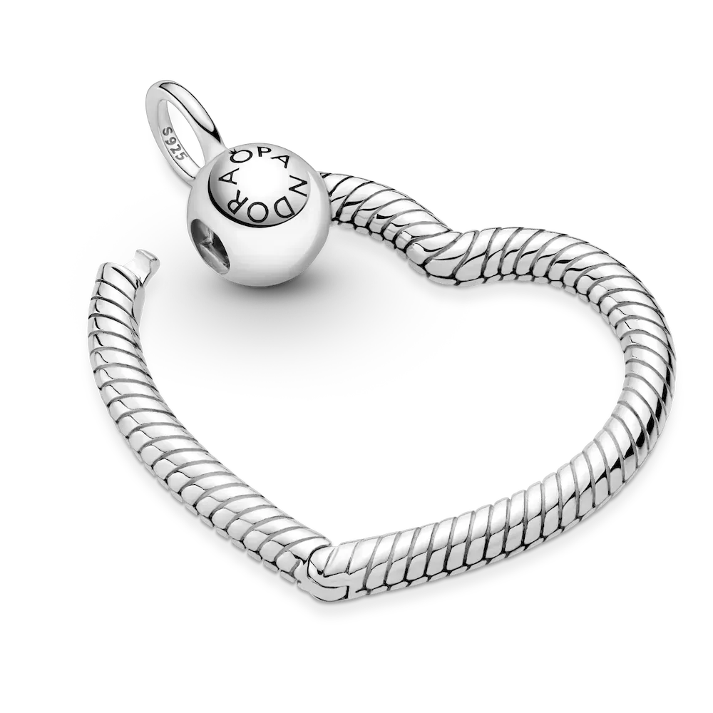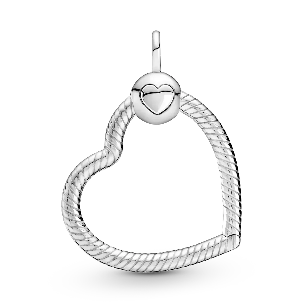 Switch up your style with the Pandora Moments Heart Charm Pendant. Hand-finished in sterling silver, this design features our popular snake chain texture. The heart-shaped pendant hangs at an angle on the bail and includes a ball-shaped clasp featuring the Pandora logo. Press the heart-shaped button on the clasp to open. Style this piece with up to three charms, dangles or pendants on a thick cable chain necklace and go for designs in contrasting metal tones for a varied look. Please note, select wide charm styles cannot be worn on this Heart Charm Pendant.