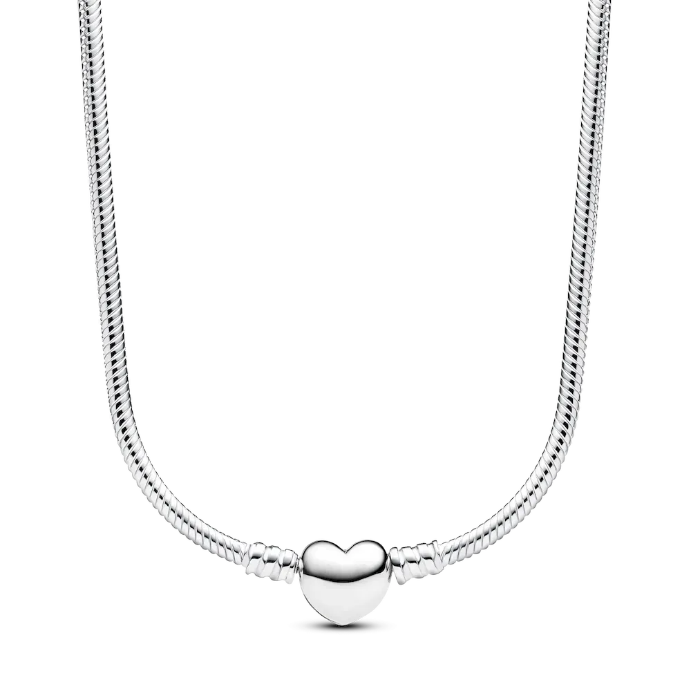 Our classic heart charm meets our iconic snake chain to create the Pandora Moments Heart Clasp Snake Chain Necklace – a tribute to all things Pandora. This snake chain necklace can hold all sizes of the Pandora O Pendant or Heart O Pendant and does not feature threaders (raised charm dividers). Style this sterling silver necklace with your favorite charms for a fully loaded look, or wear it alone as a perfectly simple statement piece.