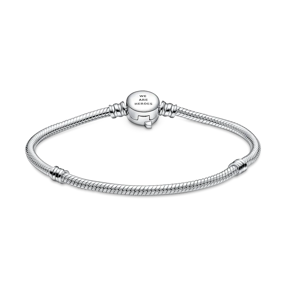 Assemble your heroes on our Pandora Moments Marvel The Avengers Logo Clasp Snake Chain Bracelet. Hand-finished in sterling silver, this charm holder features a clasp engraved with the iconic Avengers logo and etched line details. It’s the perfect way to showcase your favorite characters and tell the world about your love for the Marvel Cinematic Universe. Style it with up to 18 charms.