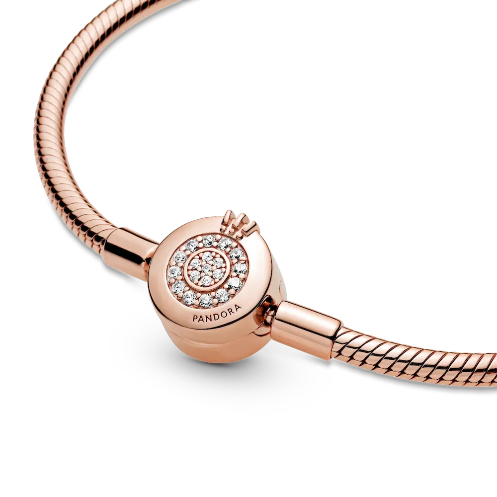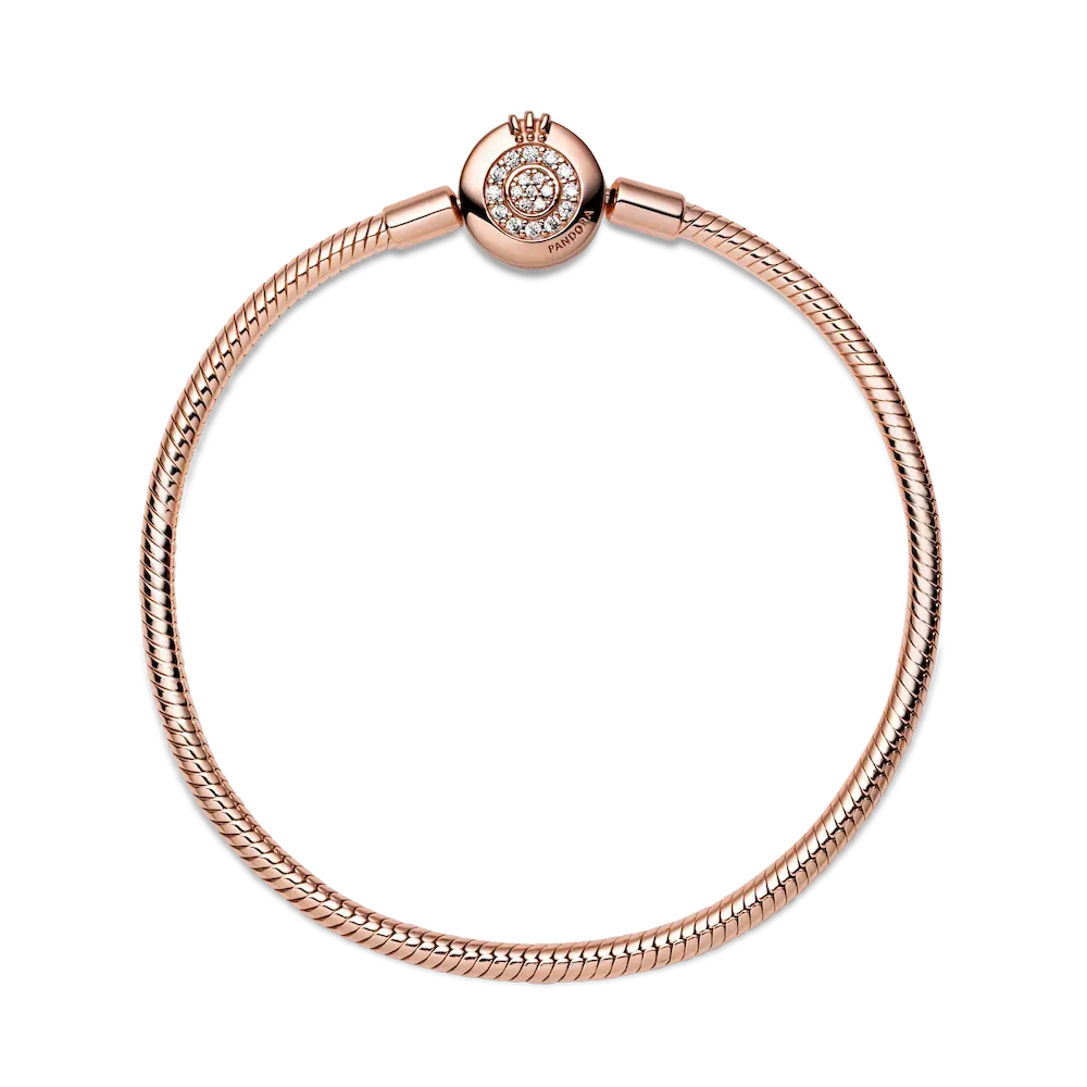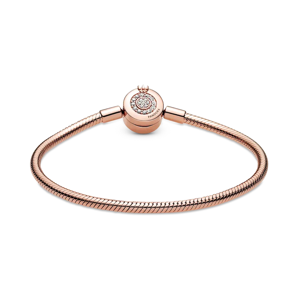 Bring some sparkle to every moment with the Pandora Moments Sparkling Crown O Snake Chain Bracelet. Hand-finished in 14k rose gold plating, the bracelet’s clasp features the iconic Pandora crown O monogram and bead-set clear cubic zirconia pavé, while the snake chain brings a chic and modern touch to your wrist. Stack it with other bracelets and load it up with favorite charms for a piece you’ll reach for over and over.