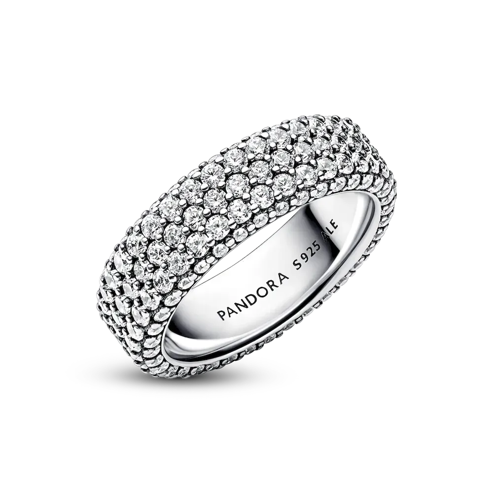 Maximize your sparkle with our hand-finished Pandora Timeless Pavé Triple-row Ring. Crafted from sterling silver, this stand-out ring features three rows of clear cubic zirconia around the center and one row facing outwards around each side, creating a slightly rounded square profile that sparkles from every angle. Wear it on its own or stacked with other Timeless Pavé rings to create as bold of a look as you want.