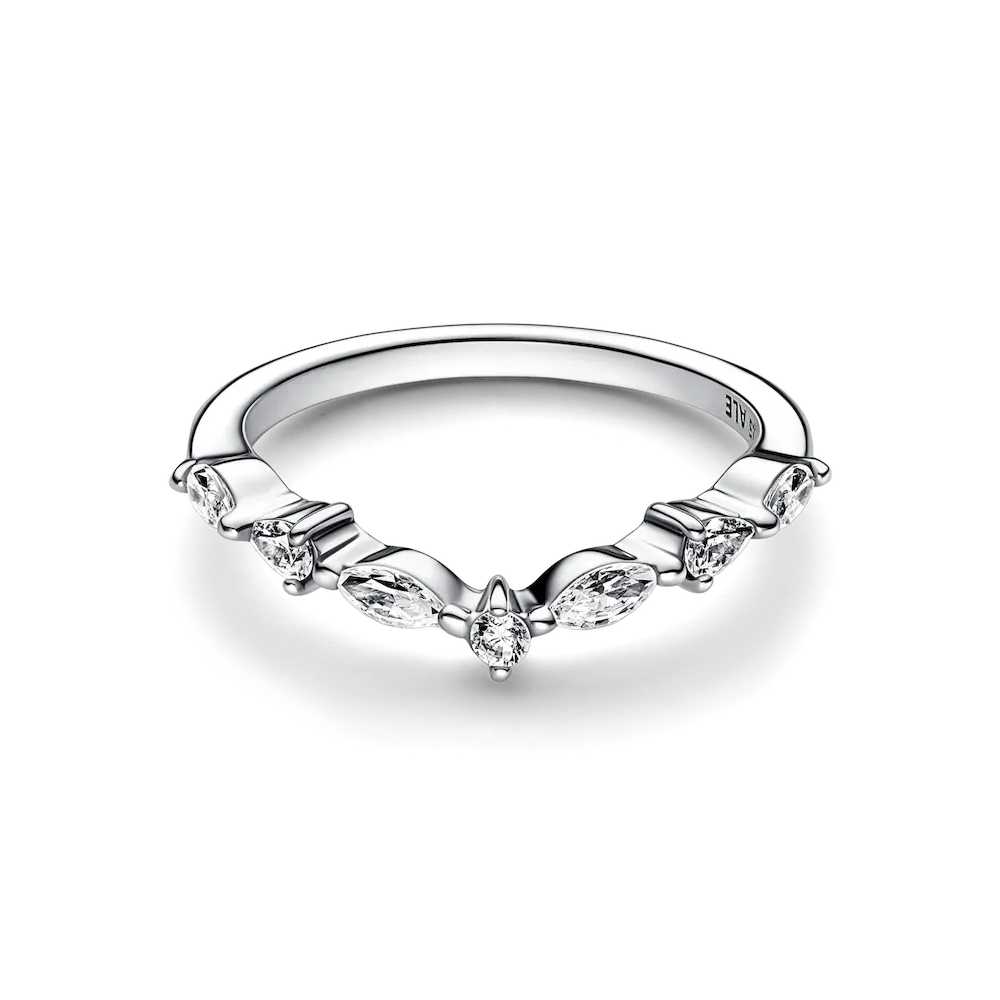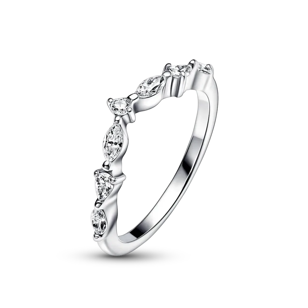 Make eye-catching statements with your everyday jewelry, with our Pandora Timeless Wish Sparkling Alternating Ring, a modern interpretation of classic ring styles. Crafted from polished sterling silver, the ring band is set to sparkle with a row of cubic zirconia in round, marquise and pear-shaped cuts. Wear yours as a single piece or layer with more sparkling Pandora Timeless rings for a modern approach to stacking that will bring timeless elegance to every look.