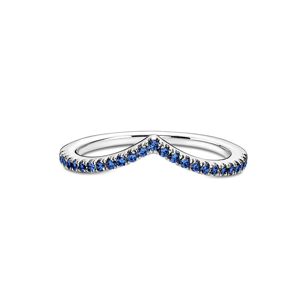 Our bestselling wishbone ring gets a colorful upgrade in this Pandora Timeless Wish Sparkling Blue Ring. Simple yet elegant, this wishbone-shaped sterling silver ring is lined with shining blue crystals and can be worn on its own as a shimmering statement, or stacks beautifully with other wishbone rings to create a unique look.