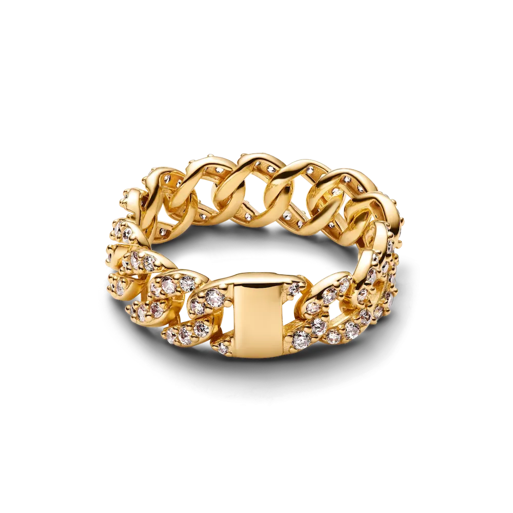 Radiance wrapped up. Our pavé Cuban chain duo features a matching ring and bracelet, each crafted in 14k gold plating and set with sparkling cubic zirconia stones.
