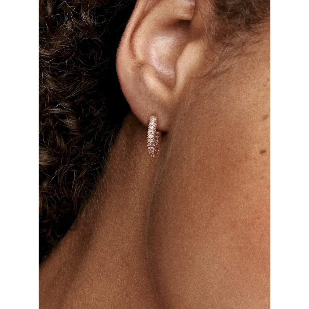 Fall for the Pavé Heart Hoop Earrings. Taking design cues from the Pandora Signature collection, these hoops have been hand-finished in 14k rose gold plating. Including clear cubic zirconia, both the inside and outside of each hoop sparkles. As an added detail, there are cut-out hearts on the sides of each earring. Team these hoops with your Pandora Signature bracelet in the same tone for a classic look.