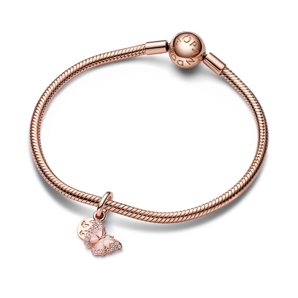 Embrace the change with our Pink Butterfly & Quote Double Dangle Charm. Hand-finished in 14k rose gold plating, it features a butterfly detailed with transparent pink enamel in the heart-shaped cut-outs of each wing and sparkling pavé along the edges. Celebrating the beauty and uniqueness of every butterfly, a round disc is engraved with