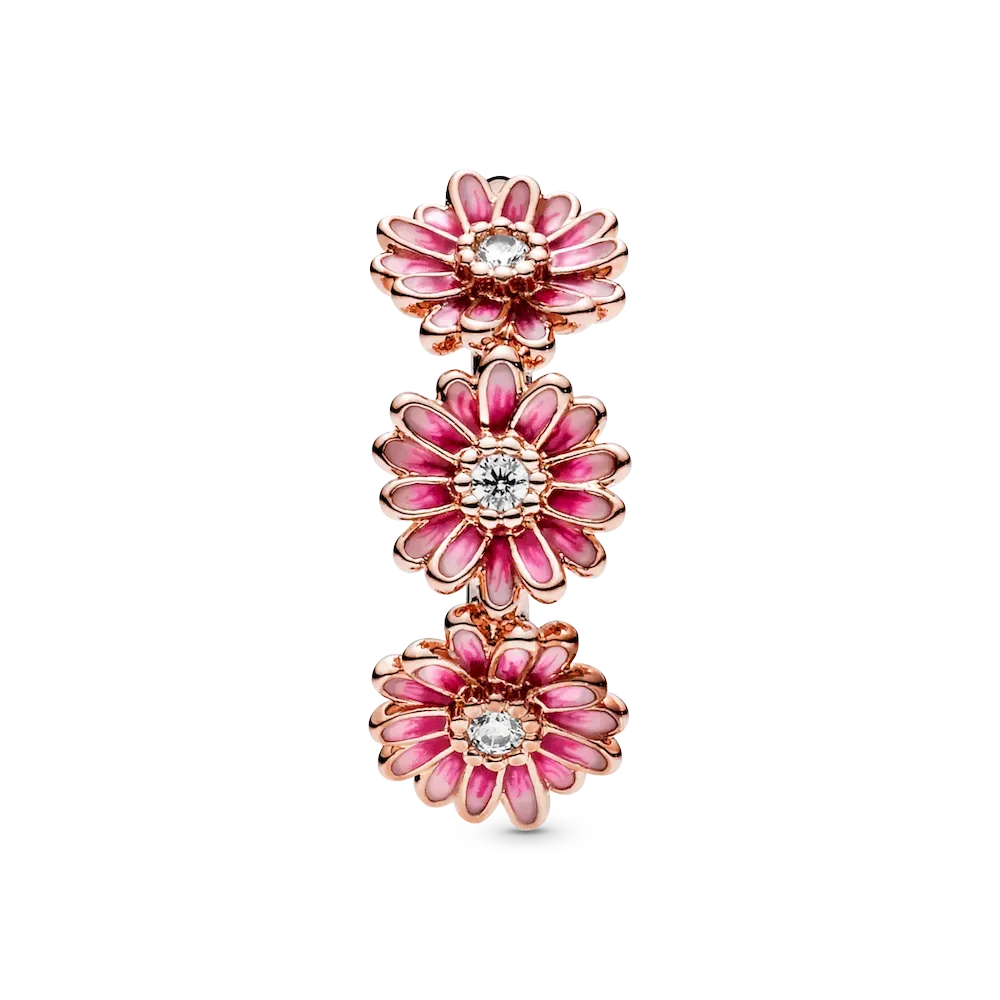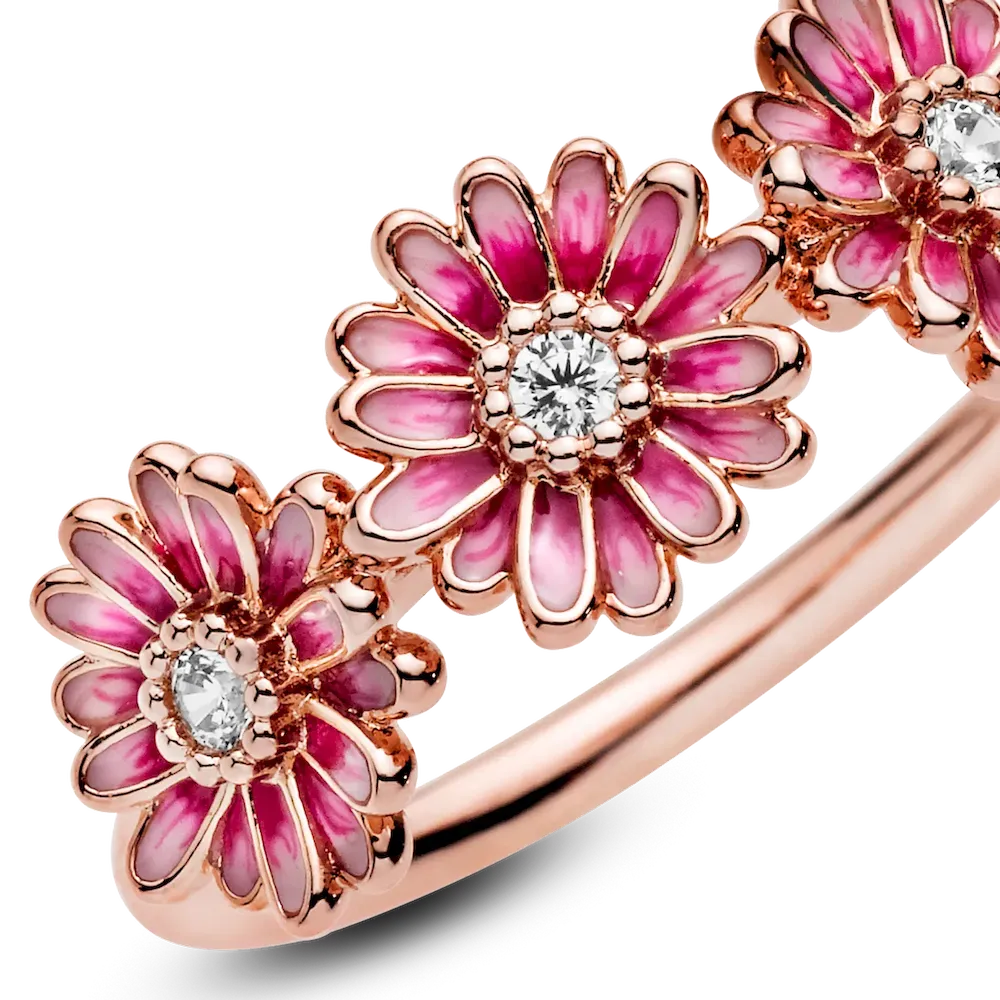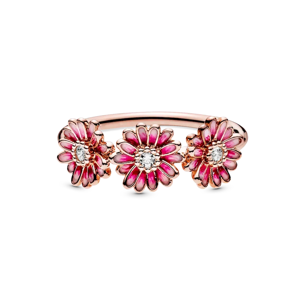 Bring flower power to your style with this flower crown-inspired Pink Daisy Flower Trio Ring. The daisy ring features a 14k rose gold-plated and is decorated with three enamel flowers with cubic zirconia in the centre. A hand-painted finish brings the vibrant petals to life with delicate shading. Inspired by the daisy, a flower which blooms in adversity and represents freedom, the ring serves as a stylish reminder to stay true to who you are.