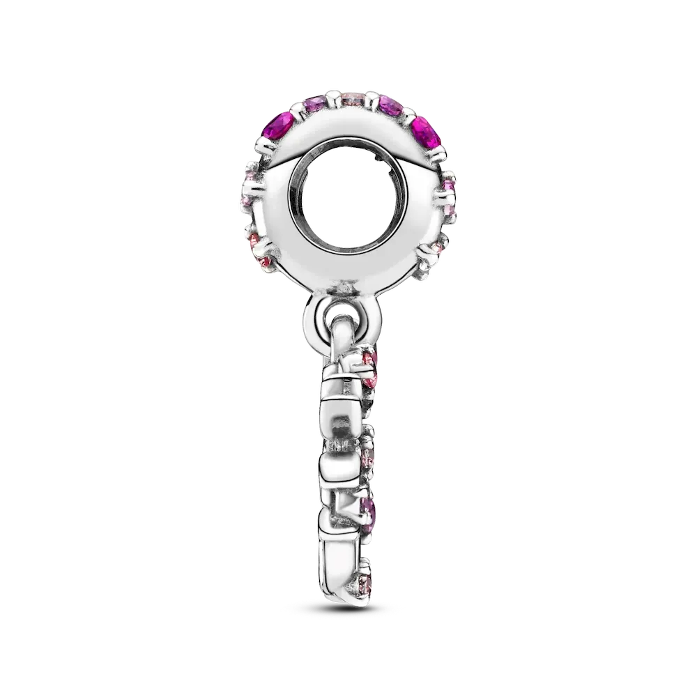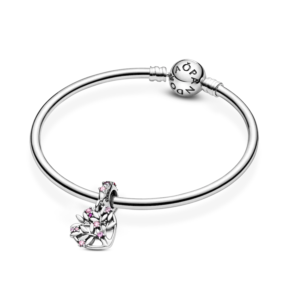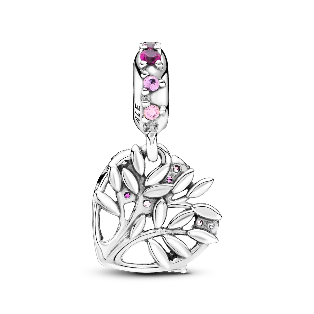Always remember your roots with the Pink Heart Family Tree Dangle Charm. This openwork dangle charm is hand-finished in sterling silver. Inside the heart shape stands a tree at an angle with its leaves extending beyond the outline. On one side, the leaves are decorated with pink stones in various shades. This effect is mirrored on the bail for a decorative finish. Wear this piece with other family-inspired charms on your bracelet for a beautiful reminder of your loved ones.