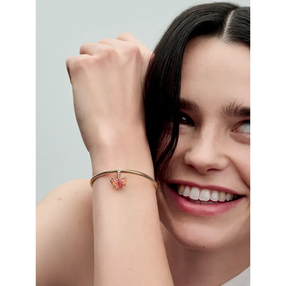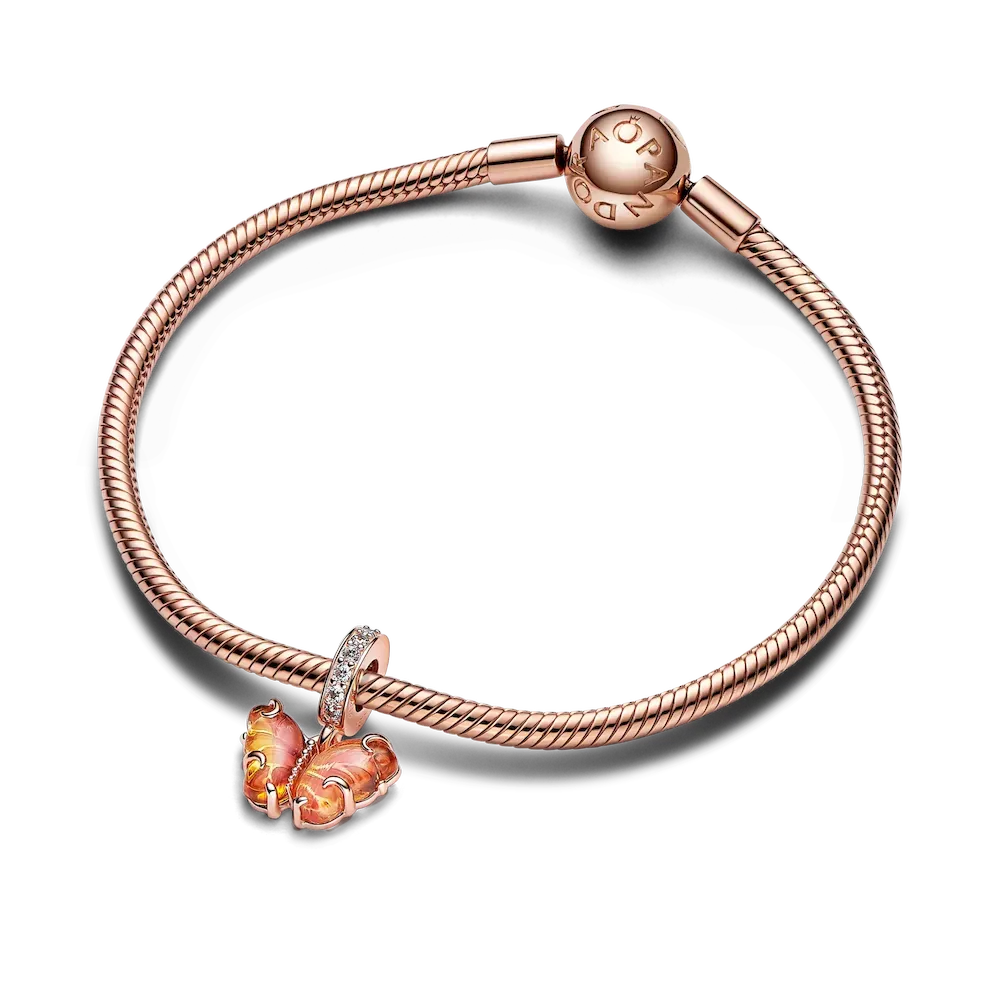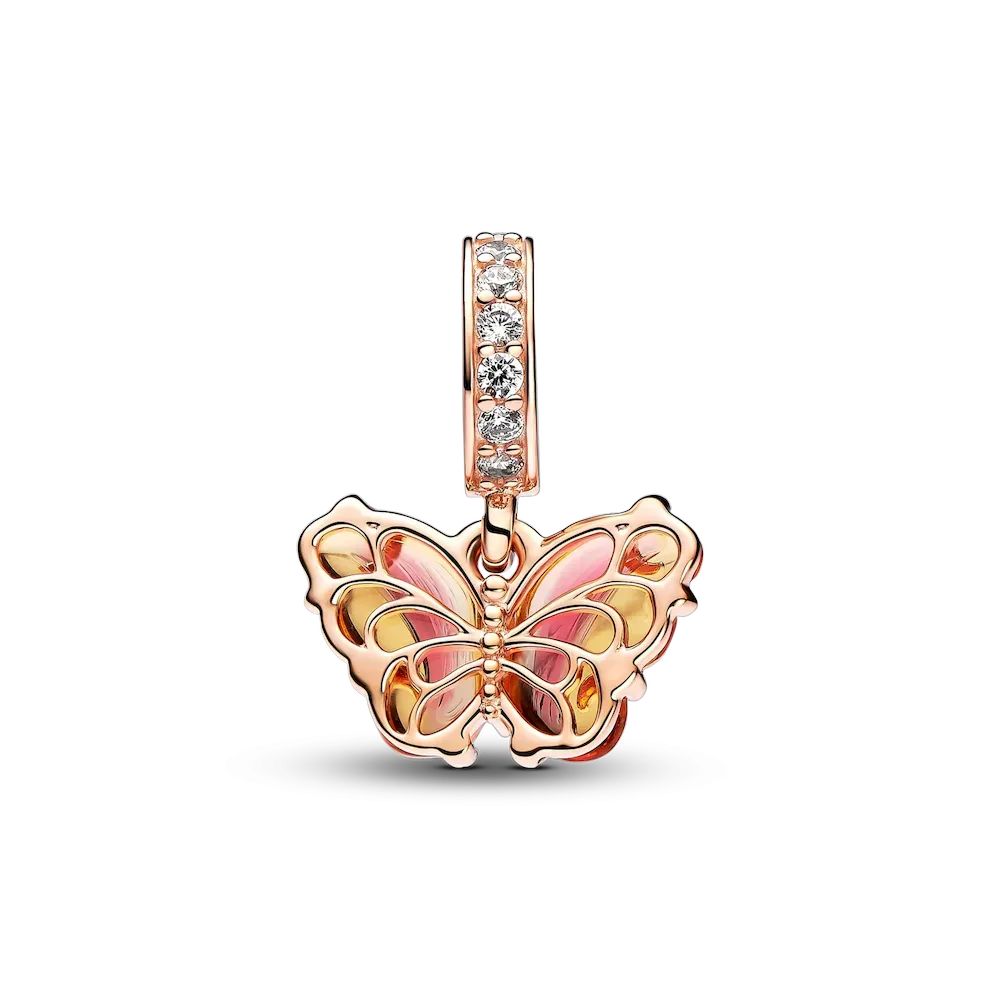 Transform into your best self with the Pink & Yellow Murano Glass Butterfly Dangle Charm. This 14k rose gold-plated charm features Murano glass wings in an orange-and-pink gradient with a cut-out pattern on the back that shows through the glass, and 14k rose gold swirls on the front. Microbeads on the butterfly’s body and pavé on the bail add a touch of delicate sparkle. Add this bright butterfly to your look as a powerful symbol of transformation and new beginnings.