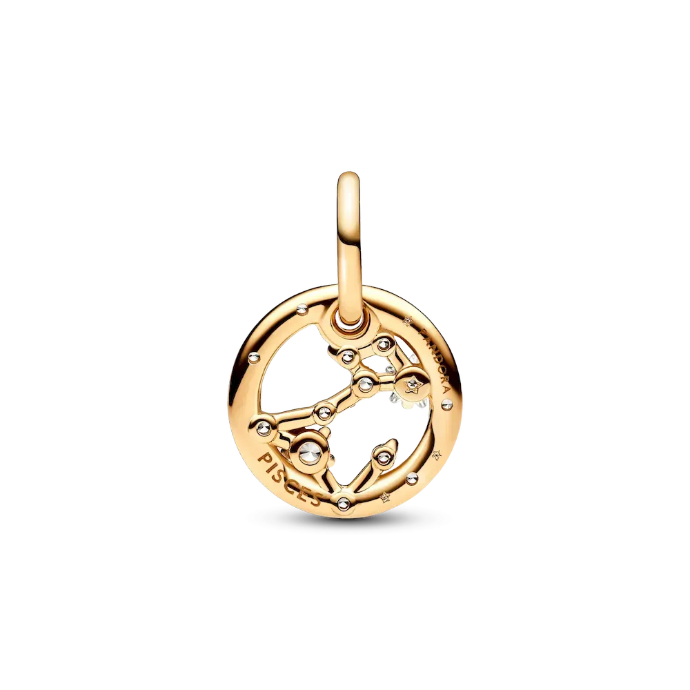 Let the stars guide your look with the Pisces Zodiac Dangle Charm Bracelet Set. This Pandora Moments dangle charm is crafted from our 14k gold-plated unique metal blend, has a circular outer frame and features clear sparkling cubic zirconia as well as the shape of the Pisces zodiac sign. The back side of the frame is engraved with