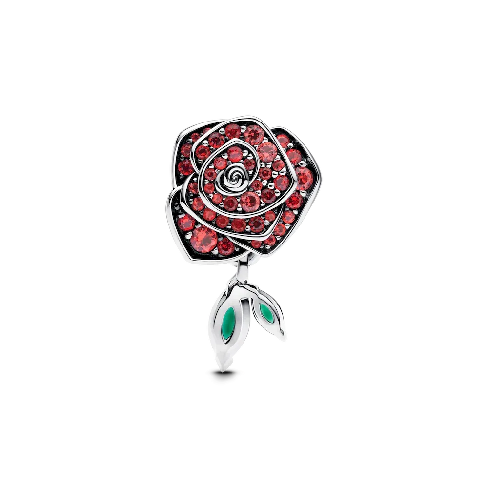 Celebrate the beauty of a blooming romance with this Rose in Bloom Charm Bracelet. The Sparkling Rose in Bloom Charm captures the delicate elegance of a rose with layered sterling silver petals, radiant red man-made crystals, and lifelike green stone leaves that dangle gracefully beneath. Pair it with the Pandora Moments Studded Chain Slider Bracelet, designed in sterling silver with an adjustable fit, to create a stunning garden-inspired piece. Perfect for symbolizing love, passion, and growth, this set makes a heartfelt gift or a meaningful addition to your jewelry collection.
