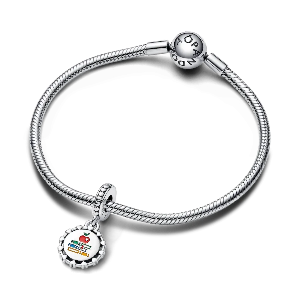 Give an apple to your teacher, the Pandora way. The School Teacher Engravable Dangle Charm is crafted from sterling silver and features a round disc with a heart pattern around the edges and along the bail. One side of the disc features symbols of school and learning: a stack of books with an apple on top, brought to life with vibrant coloured enamel. The other side is blank for your own personal engraving. A meaningful way to show your appreciation for a special teacher in your life.