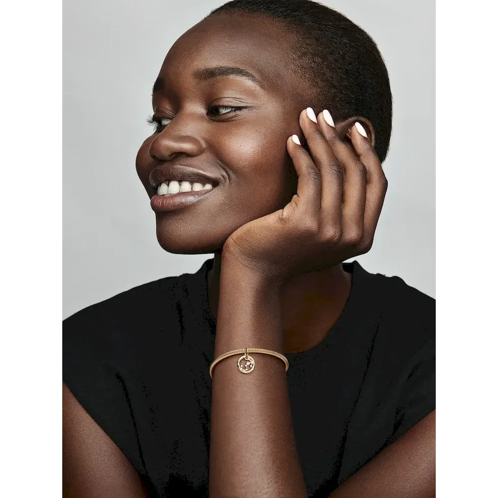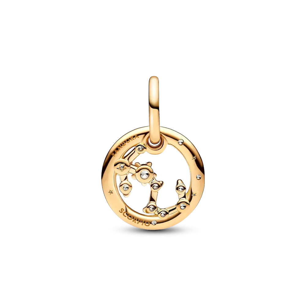 Let the stars guide your look with the Pandora Scorpio Zodiac Dangle Charm Bracelet Set. This Scorpio charm is crafted from our 14k gold-plated unique metal blend, has a circular outer frame and features clear sparkling cubic zirconia as well as the shape of the Scorpio zodiac sign. The back side of the frame is engraved with