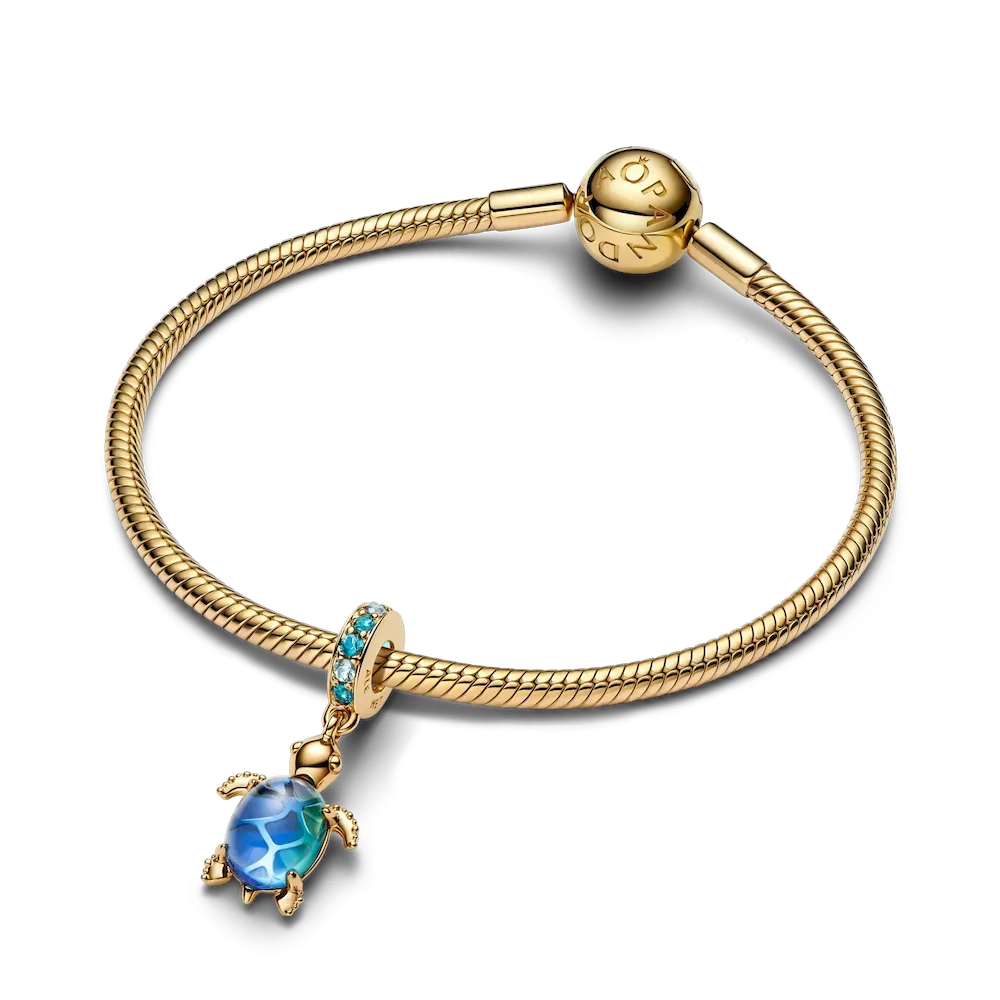 Celebrate the beauty of the deep blue sea with this sea turtle charm, featuring a peacock Murano glass shell, shimmering crystals and a cut-out pattern that shines through.