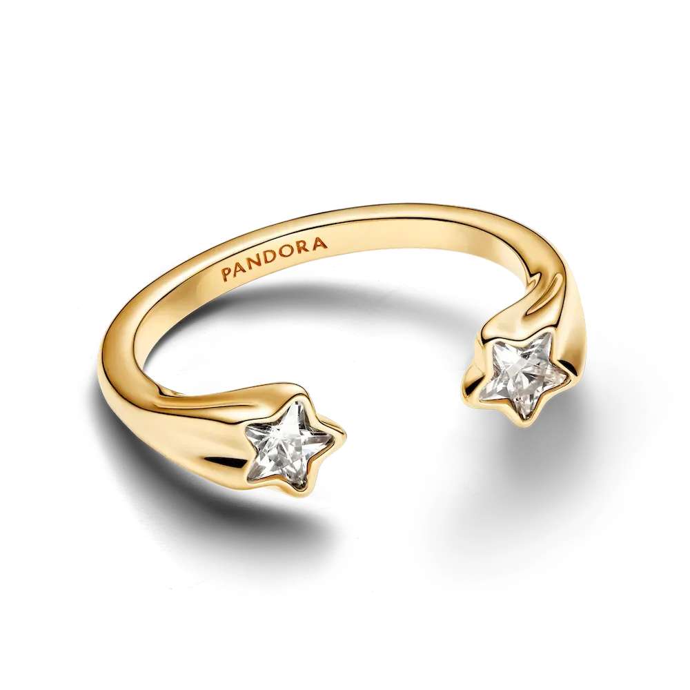 Elevate your style with the Shooting Stars Open Ring, crafted from our 14k gold-plated unique metal blend. This eye-catching piece features two star-cut clear cubic zirconia, each positioned at the ends of an open band adorned with a delicate shooting stars motif. Inspired by the idea that the world shines brighter when we’re with loved ones, it’s perfect for stacking with other rings or wearing solo for a celestial statement. Pair it with a simple bracelet for a festive look.