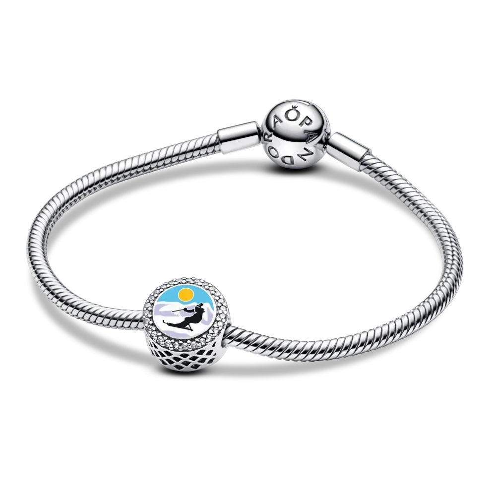 Adorned with glittering pave, this sterling silver button charm features a picturesque scene: a skier descending a snowy mountain, with beautiful blue and white enamel capturing the icy slopes and sunny sky. It’s a must-have piece if powder is your passion or it makes the perfect gift for someone who shares that thrill.