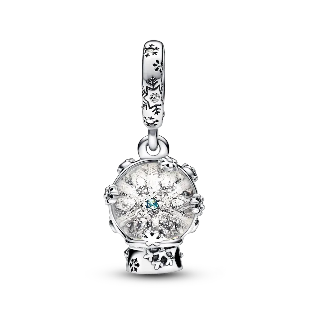 Capture a piece of holiday magic with this Snowflake Snow Globe Dangle Charm. Crafted from sterling silver and Murano glass, this charm features a snowflake motif surrounded by glitter and set within a glass ball, which creates a special, magical feeling. The intricate design requires high levels of craftsmanship to create, as it features lots of details including grooved and raised snowflake shapes on the base, scattered across the snow globe and along the bail. Turn the charm over to find the message