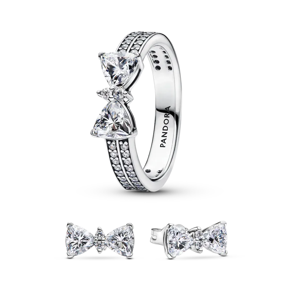 Add a touch of elegance to your look with the Sparkling Bow Collection from Pandora. Featuring delicate bows adorned with shimmering cubic zirconia, both the Sparkling Bow Double Row Ring and the Sparkling Bow Stud Earrings capture the essence of grace and charm. The Double Row Ring showcases two rows of sparkling stones, adding depth and sophistication to its playful bow design, while the Stud Earrings offer a refined, minimalist style that complements any outfit. Perfect for elevating everyday looks or adding a soft, feminine touch to special occasions, these pieces are a celebration of timeless beauty and understated luxury.