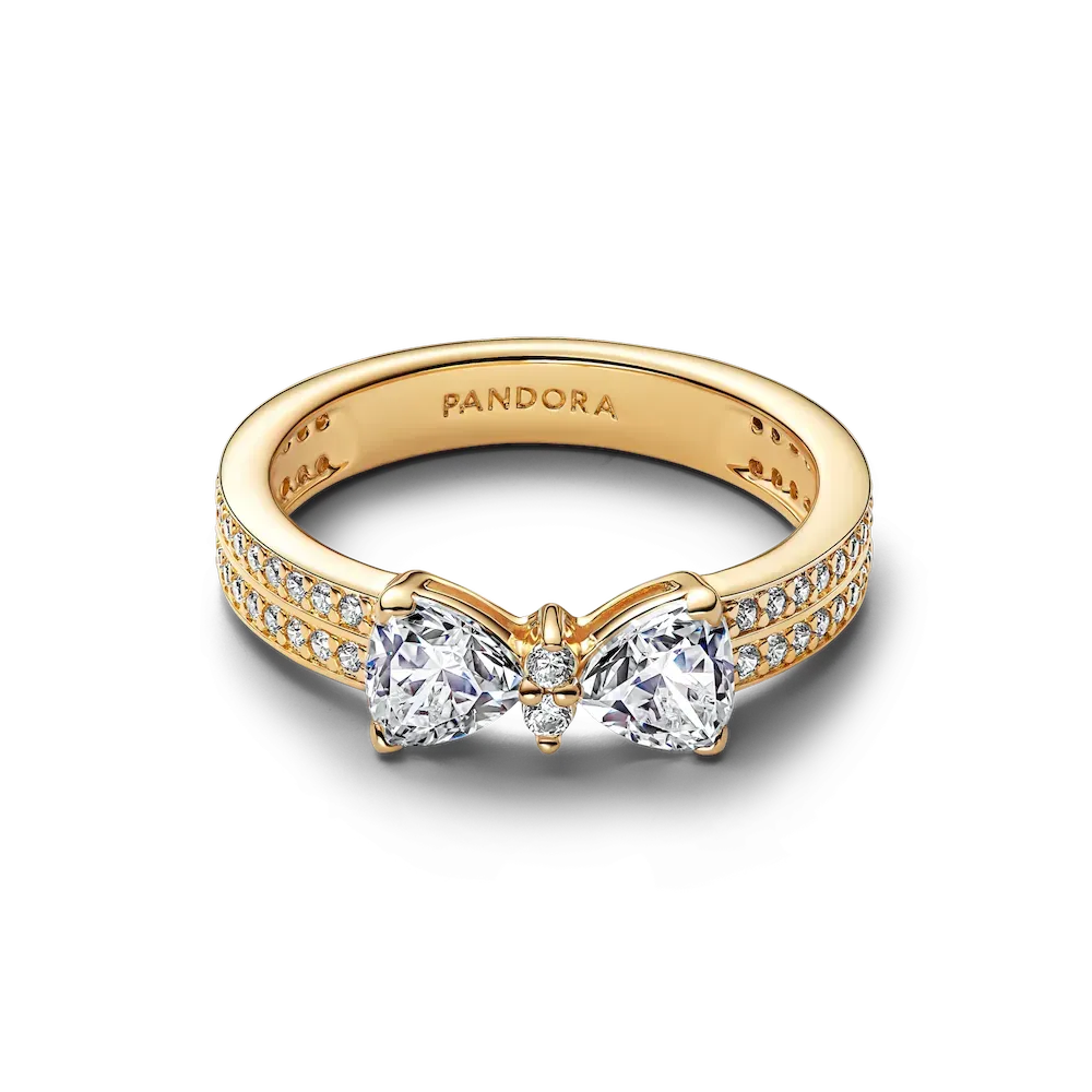 This eye-catching ring features a contemporary bow motif surrounded by cubic zirconia, accented by a double row of pavé stones. Perfect for adding a touch of shine to any outfit.