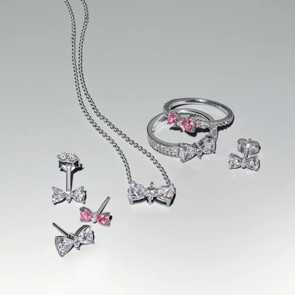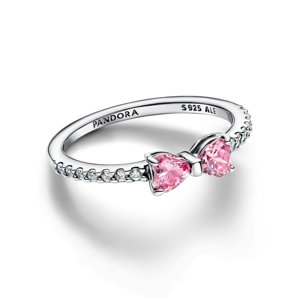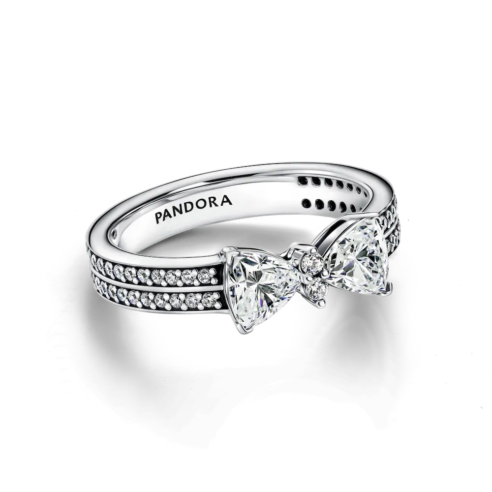 Celebrate elegance and sparkle with the Pandora Sparkling Bow Ring Gift Set, featuring the Sparkling Bow Double-row Ring and the Sparkling Pink Bow Ring. The Sparkling Bow Double-row Ring, crafted from sterling silver, showcases a contemporary bow motif adorned with clear cubic zirconia, with a double row of pavé stones on the band adding extra brilliance. The Sparkling Pink Bow Ring features two prong-set heart-cut fancy pink cubic zirconia stones at its center, symbolizing light and festivity, with a delicate bow motif and a band adorned with 14 bead-set round brilliant-cut clear cubic zirconia. Together, these rings create a stunning set that embodies joy, celebration, and timeless elegance, perfect for gifting to someone special or treating yourself to a touch of luxury.