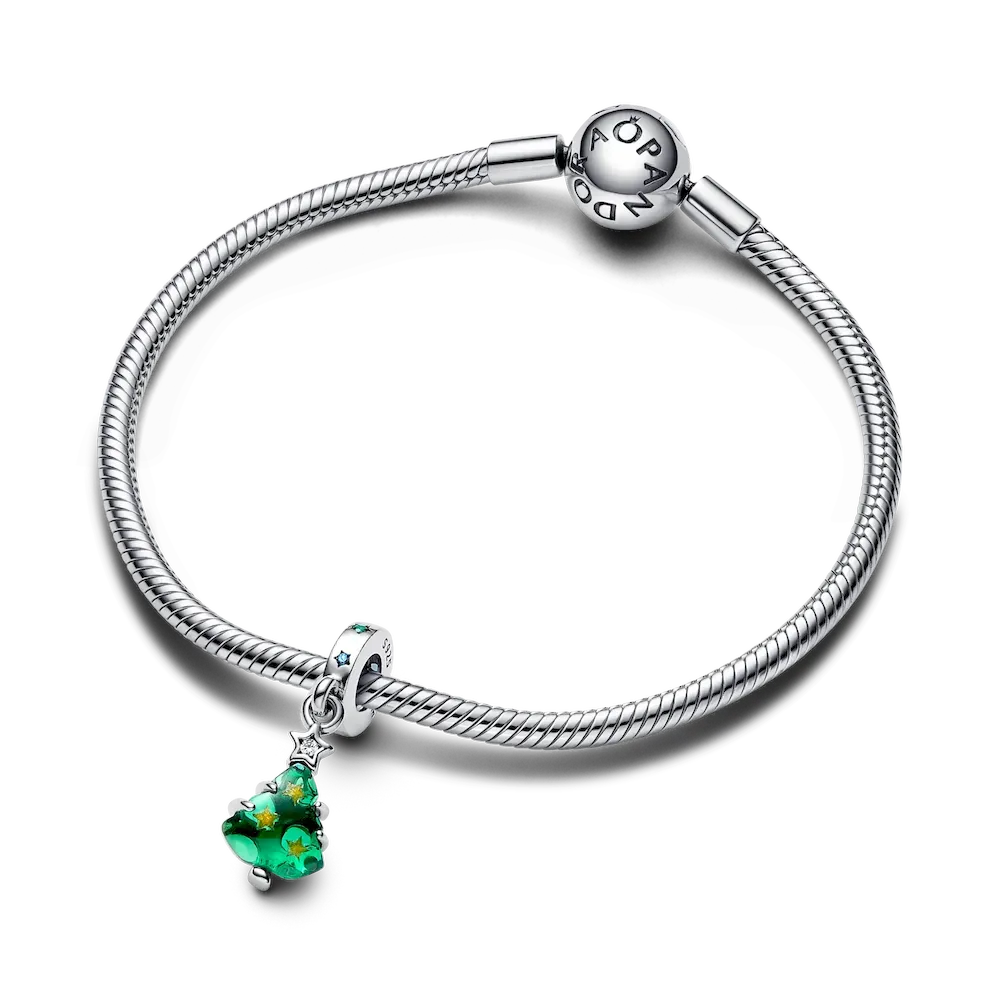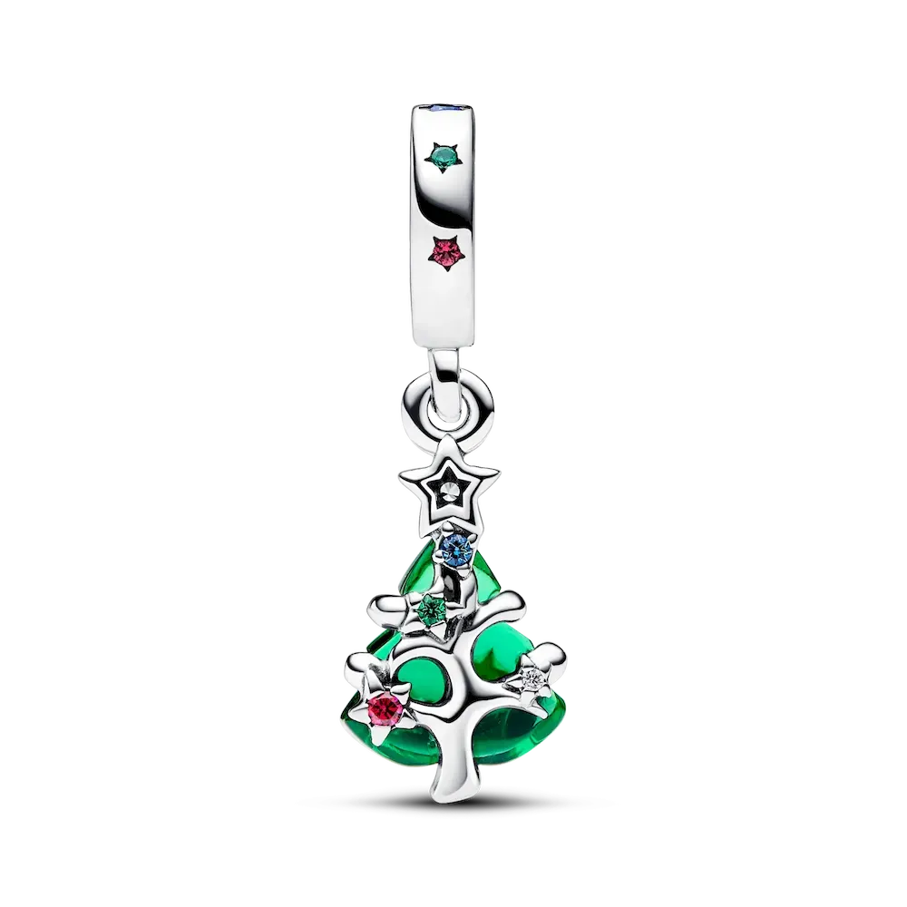Shine bright this season with the Sparkling Christmas Tree Dangle Charm. Capture the true magic of the holiday season with this silver dangle charm that features a tree-shaped green man-made crystal dotted with shimmering golden enamel to represent stars. On the other side, different colored man-made stones are set along the tree’s sterling silver branches. A twinkling, brightly colored Christmas charm brings the most festive of touches to your collection of Pandora Moments charms – and every holiday look you pair them with.