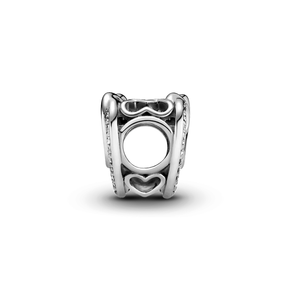 Gift a symbol of your love with the Sparkling Entwined Hearts Charm. Hand-finished in sterling silver, this design includes intertwining polished sterling silver hearts and sparkling stone-embellished hearts on the front and back. Entwined hearts also feature on the sides. Inspired by the famous love story of Romeo & Juliet, present this detailed openwork charm to someone special for Valentine’s Day.