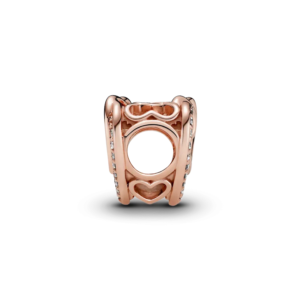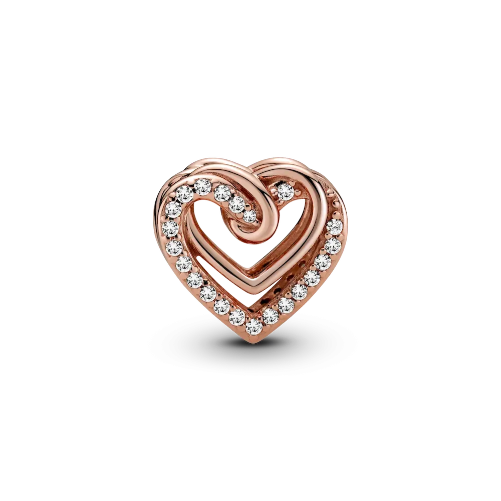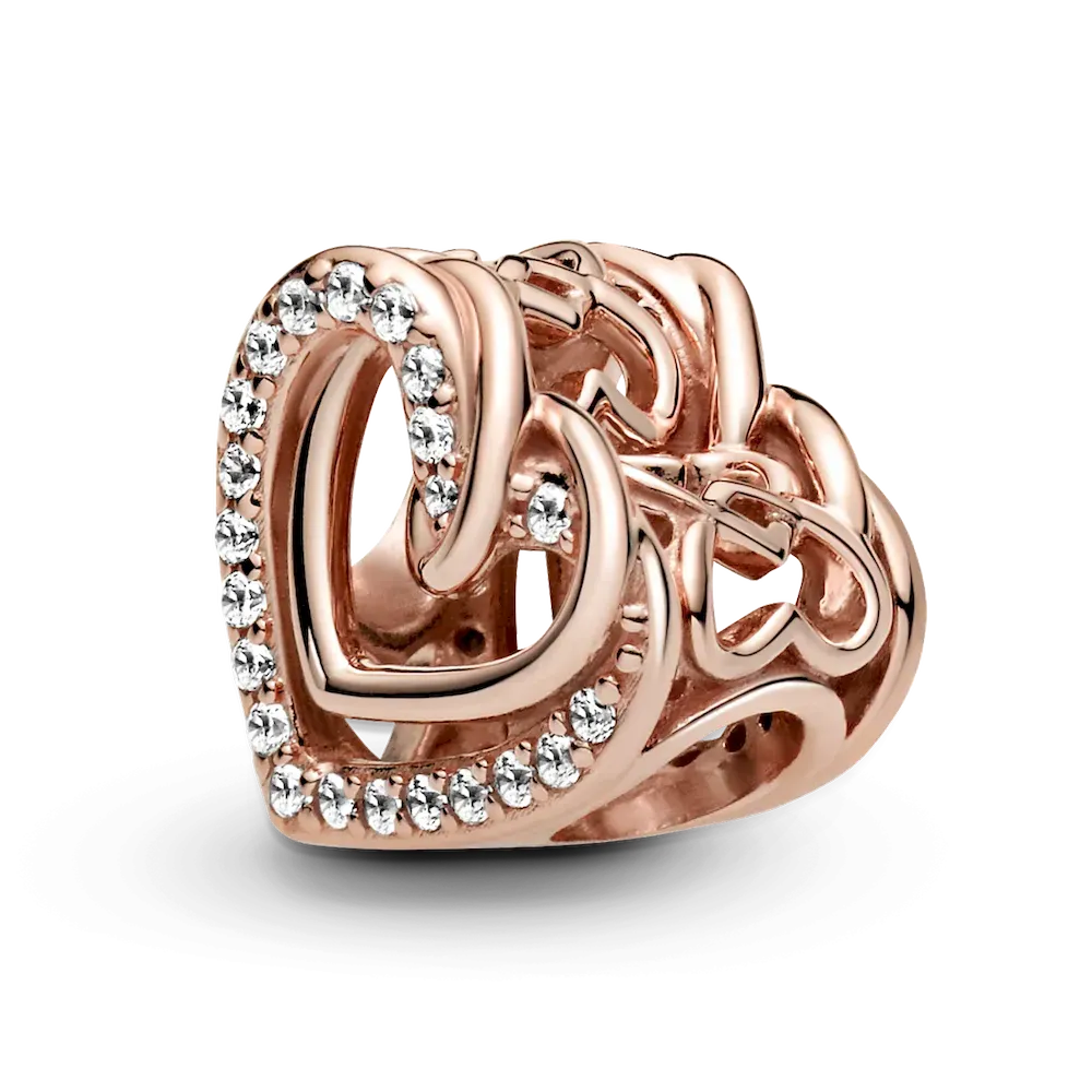 Gift a symbol of your love with the Sparkling Entwined Hearts Charm. Hand-finished, this design includes intertwining polished 14k rose gold-plated hearts and sparkling stone-embellished hearts on the front and back. Entwined hearts also feature on the sides. Inspired by the famous love story of Romeo & Juliet, present this detailed openwork charm to someone special for Valentine’s Day.