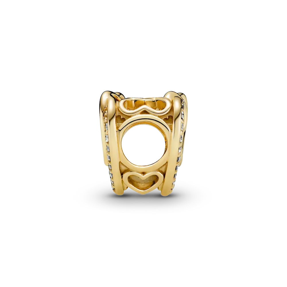 This Sparkling Entwined Hearts Charm is the perfect gift for someone with a heart of gold. Hand-finished, this design includes intertwining polished 14k gold-plated hearts and sparkling stone-embellished hearts on the front and back. Entwined hearts also feature on the sides. Inspired by eternal love, present this detailed openwork charm to someone special.