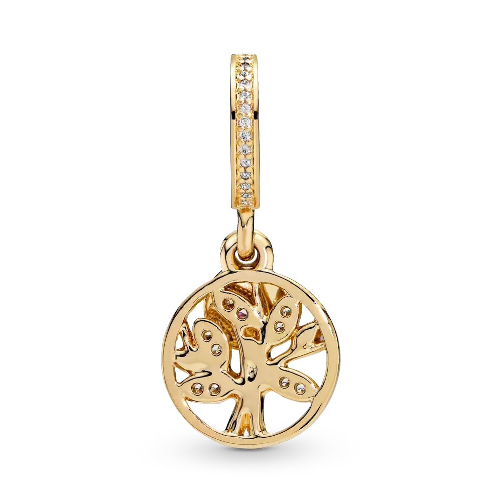 This 14k gold-plated Sparkling Family Tree Dangle Charm represents how families are connected through many generations. The golden hue and the stone-encrusted leaves create a radiant effect to embellish your choice of bracelet or chain.