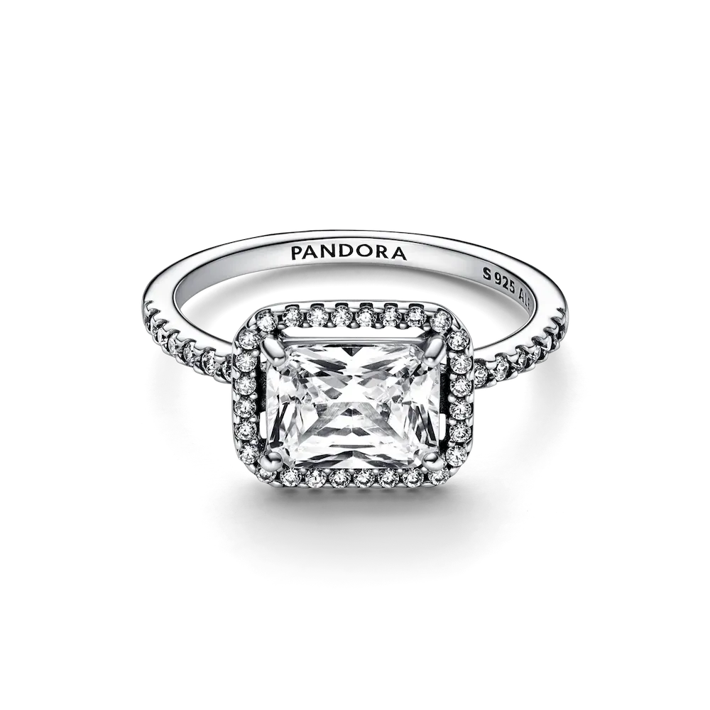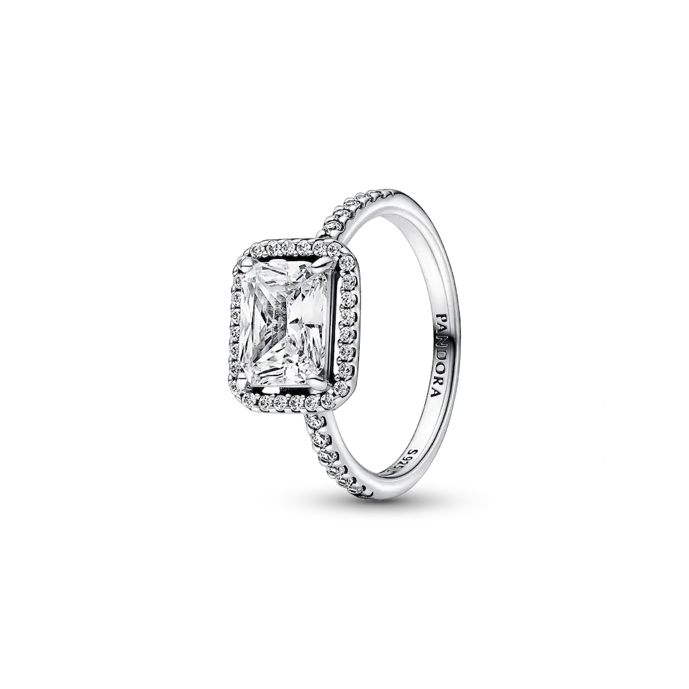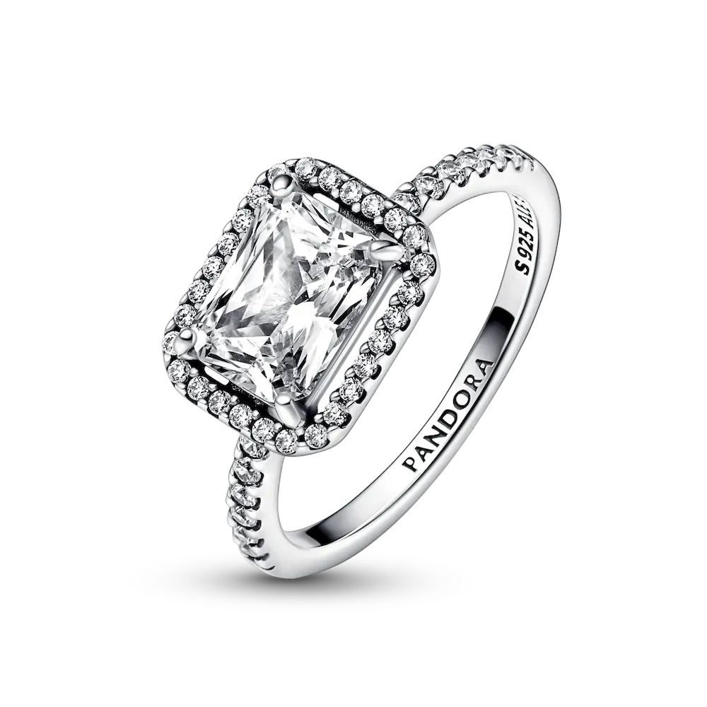 Make a stand-out statement with the Sparkling Halo Ring Set. This sterling silver ring set includes a stunning vintage-inspired ring embellished with a halo of sparkling cubic zirconia stones and showcasing a large rectangular radiant-cut stone as its centerpiece. The central stone is slightly raised so the ring can sit flush against the bold but simple eternity ring, with its full circle of cubic zirconia stones. Wear each ring on its own or style them together for an effortless, contemporary look with high-impact sparkle.