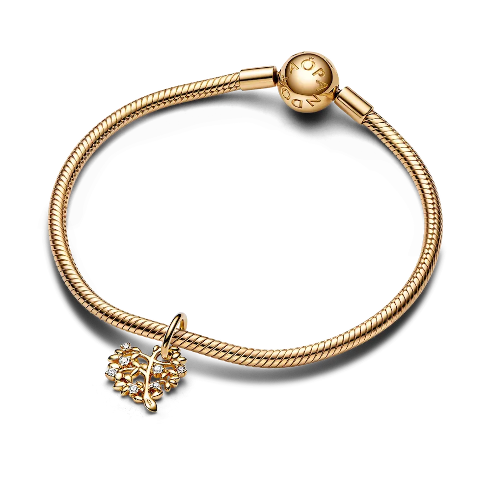 Embrace your love for your family with this elegant and symbolic charm. The Sparkling Heart & Family Tree Dangle Charm is crafted from solid 14k gold, forming a heart-shaped family tree motif set with sparkling cubic zirconia stones adorning its branches and leaves. With deep roots and sheltering branches, the family tree is a powerful symbol of deep love for your family and community.