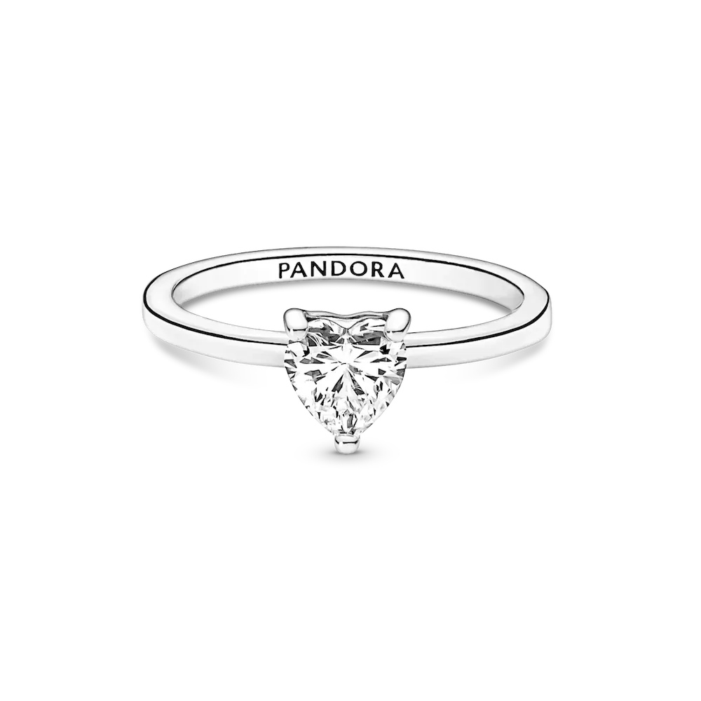 The latest addition to our solitaire collection, the Sparkling Heart Solitaire Ring features a heart-shaped clear cubic zirconia as the centerpiece. The Pandora logo is engraved on the inside of the polished shank. Stack this ring with other sterling silver pieces for a monochromatic look or mix metal finishes to make a unique statement.