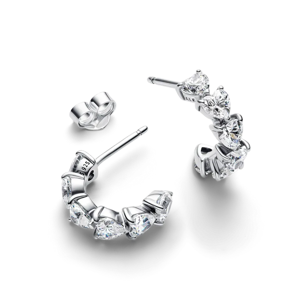 Listen with your hearts. Crafted in sterling silver, these sparkling open hoop earrings feature 12 heart-shaped cubic zirconia. Inspired by the profound bond of connected love, they make a meaningful gift for the special someone in your life. Style with more heart-shaped earrings to load up on love or wear them alone as a romantic statement.