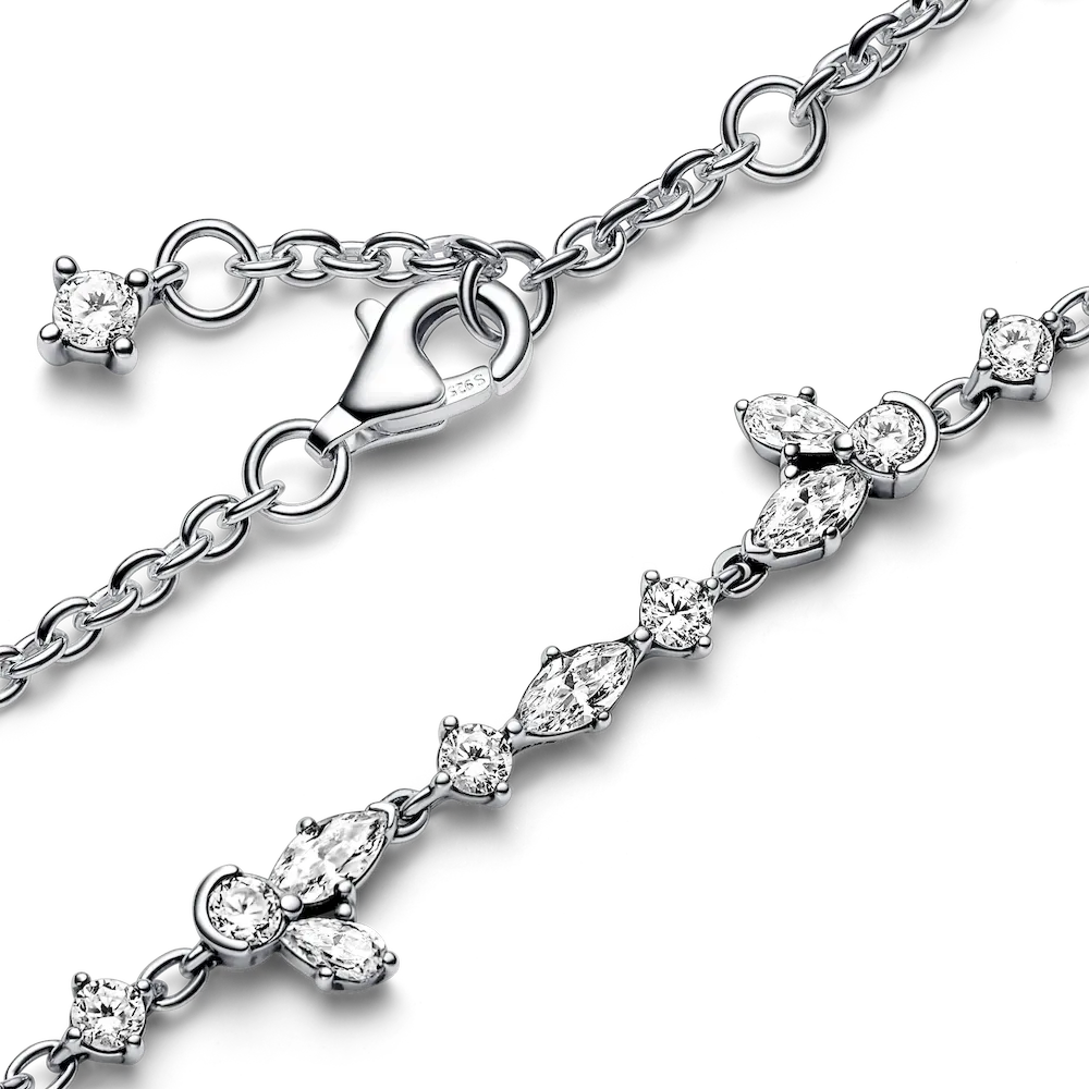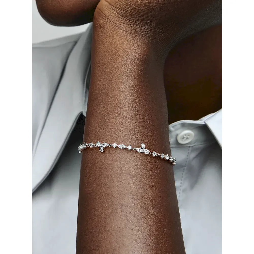Take inspiration from the beautiful shapes of nature with the Sparkling Herbarium Cluster Chain Bracelet. Inspired by pressed flowers and leaves, this hand-finished sterling silver bracelet is set with cubic zirconia stones in alternating round and marquise shapes along half the chain, with two clusters of round, marquise and pear-shaped stones creating nature-inspired shapes, attached by jump rings so they move naturally with the chain. The bracelet is adjustable to three sizes. Elevate your looks with this elegant reminder of the beauty of nature.