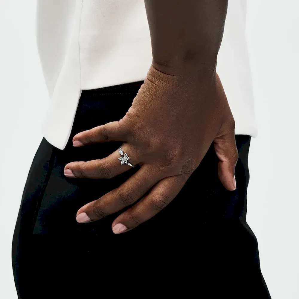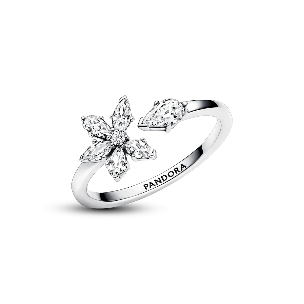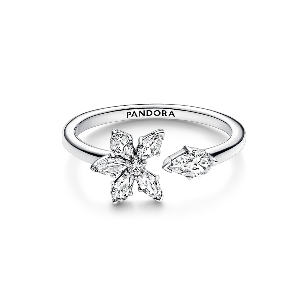 Our Sparkling Herbarium Cluster Open Ring is inspired by the everlasting beauty of nature. Echoing petal silhouettes, a pear-shaped stone has been plucked from a cluster of alternating marquise- and pear-shaped stones and set at the opposite end of a split band. A single round stone sparkles at the center of the cluster. Wear this sterling silver ring to add an elegant touch of the natural world to your everyday looks. Please note: this ring is not size adjustable and any attempt to open, bend or squeeze it may result in damage.