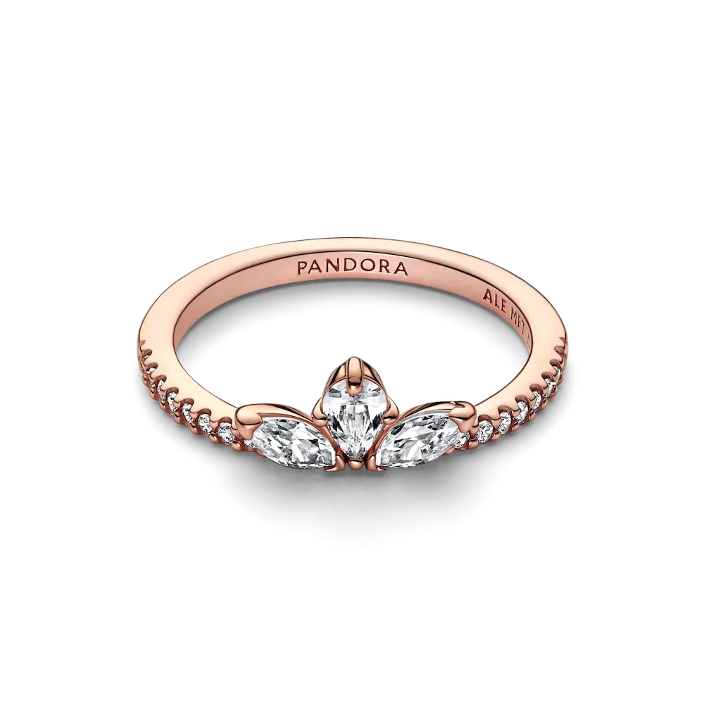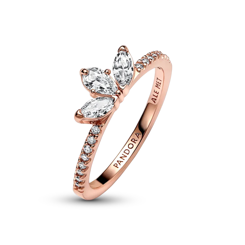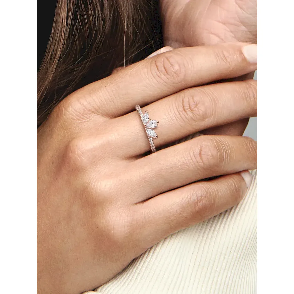 Our Sparkling Herbarium Cluster Ring features three central stones in a petal shape, two marquise-shaped and one pear-shaped. Finished in 14k rose gold plating, this elegant ring is inspired by the beauty of nature, with petal silhouettes that will never go out of style. When styled back-to-back, they form a whole cluster motif, giving an air of completeness to your stack.