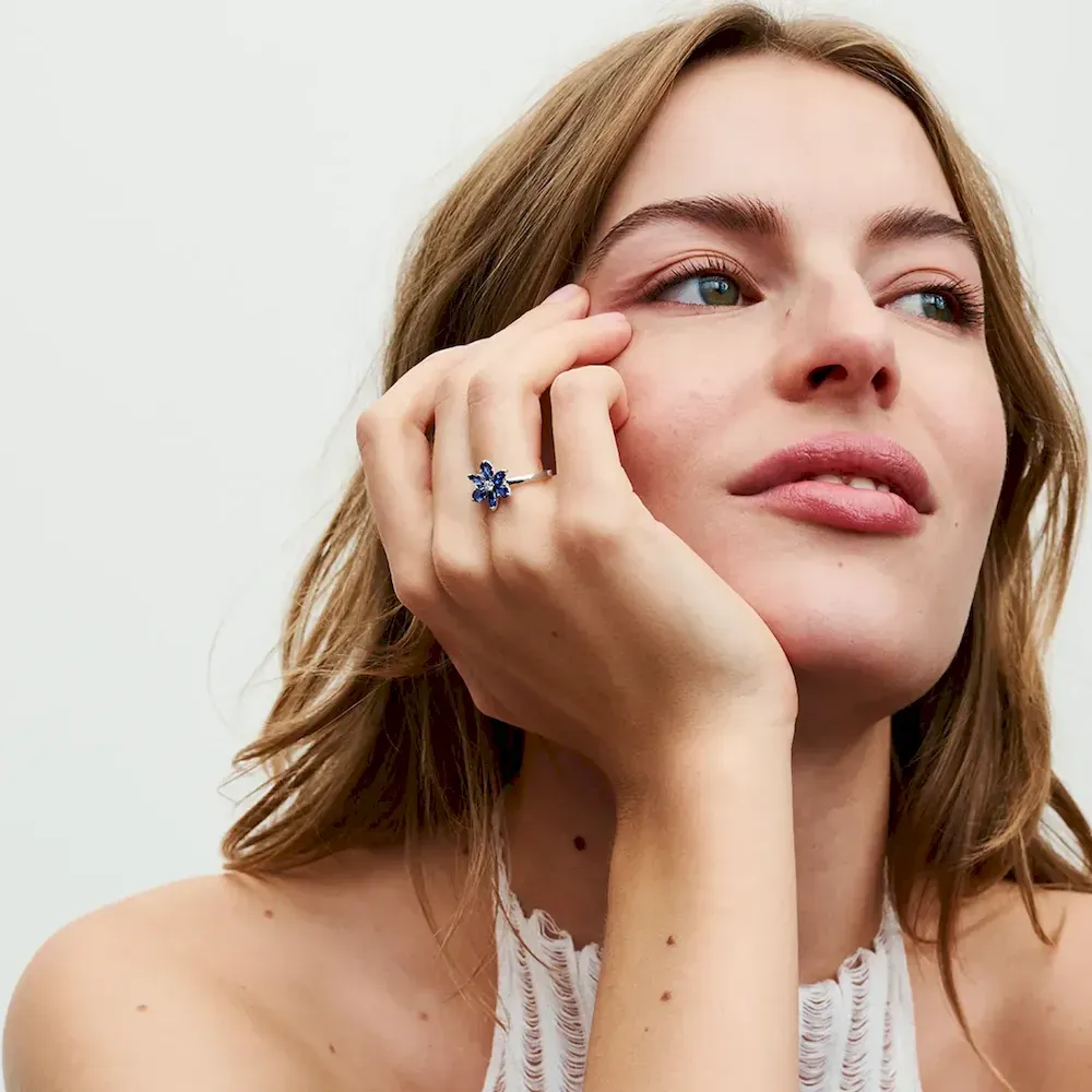 Sparkle in color with the Sparkling Herbarium Cluster Ring. Featuring man-made crystals in the shape of a flower, this sterling silver ring celebrates the beauty of nature. A cluster of alternating pear-shaped and marquise-shaped blue stones are set around a clear center stone, their various shapes evoking the natural symmetry found in the outdoors. Gift it to a nature lover in your life or wear it yourself alongside other Pandora herbarium-inspired styles for an eye-catching coordinated look.