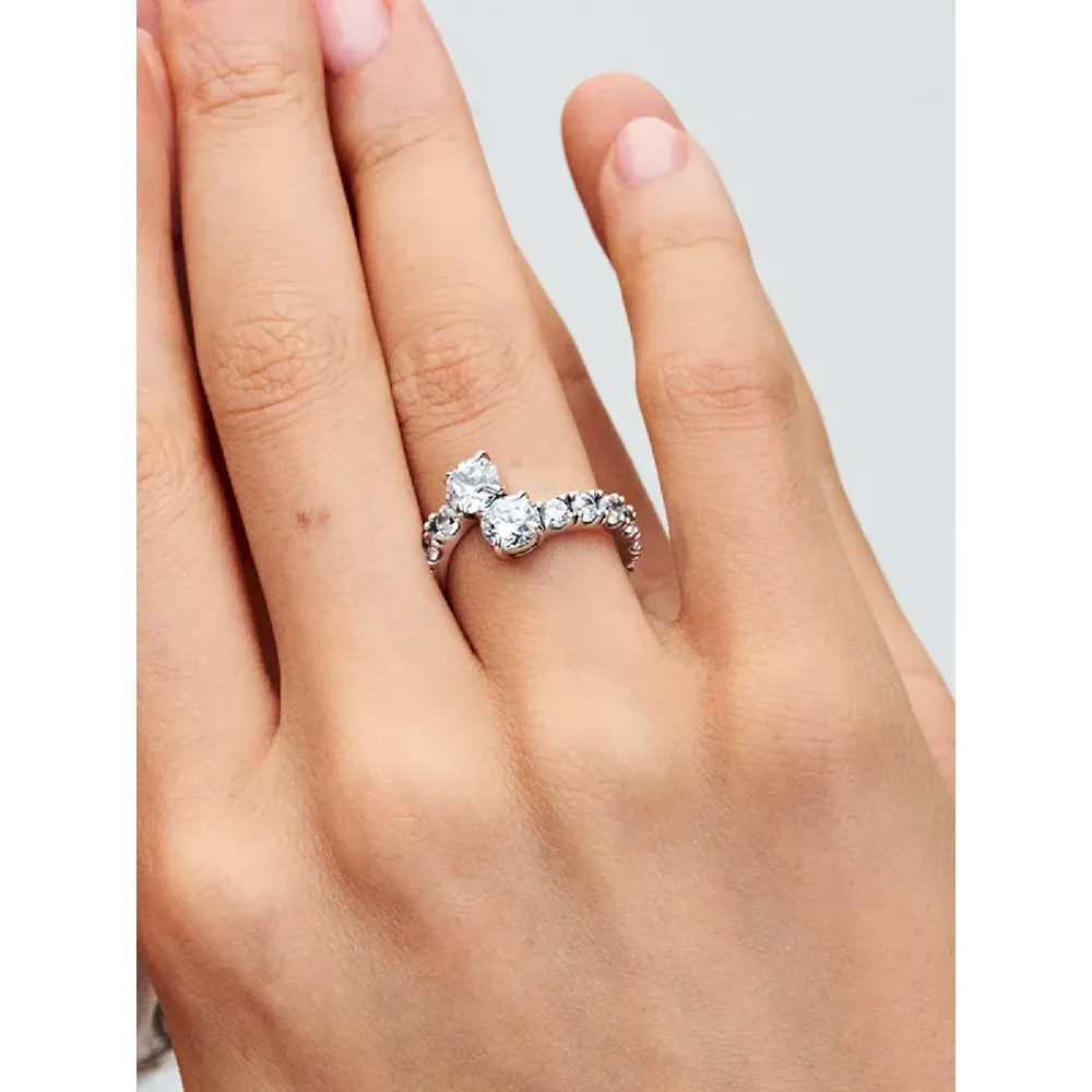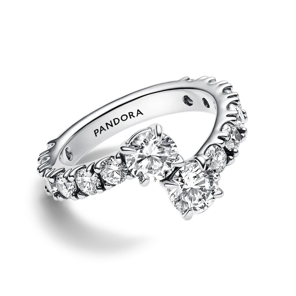 Sparkle with style with the Sterling Silver Sparkling Overlapping Band Ring from Pandora’s Timeless collection. Channeling cool tones, this ring showcases a row of meticulously set clear cubic zirconia stones. The band subtly overlaps at the centre, with larger stones on each end, forming an eye-catching centerpiece. Inspired by Pandora’s Sparkling Row Eternity Rings, this piece offers a bold, dimensional look. Elevate your style with this exquisite sterling silver ring.