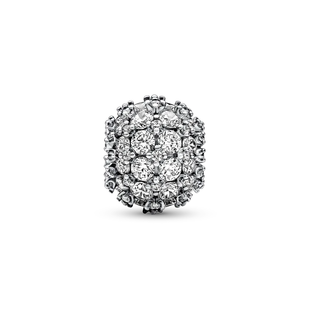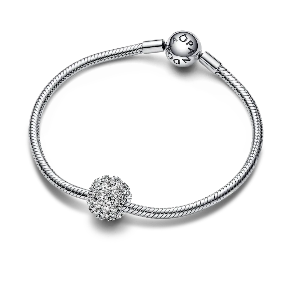Add a touch of timeless sparkle to your look with the elegant and symbolic Sparkling Pavé Round Charm. This spherical sterling silver charm is set with a total of 88 clear cubic zirconia stones in different sizes, creating a voluminous geometric effect. 88 is a powerful number that represents progress, success and good fortune. It also resembles a double infinity symbol, representing the unlimited possibilities the future holds. Add it to your favorite jewelry styling or gift it to a loved one as a symbol of good things ahead.
