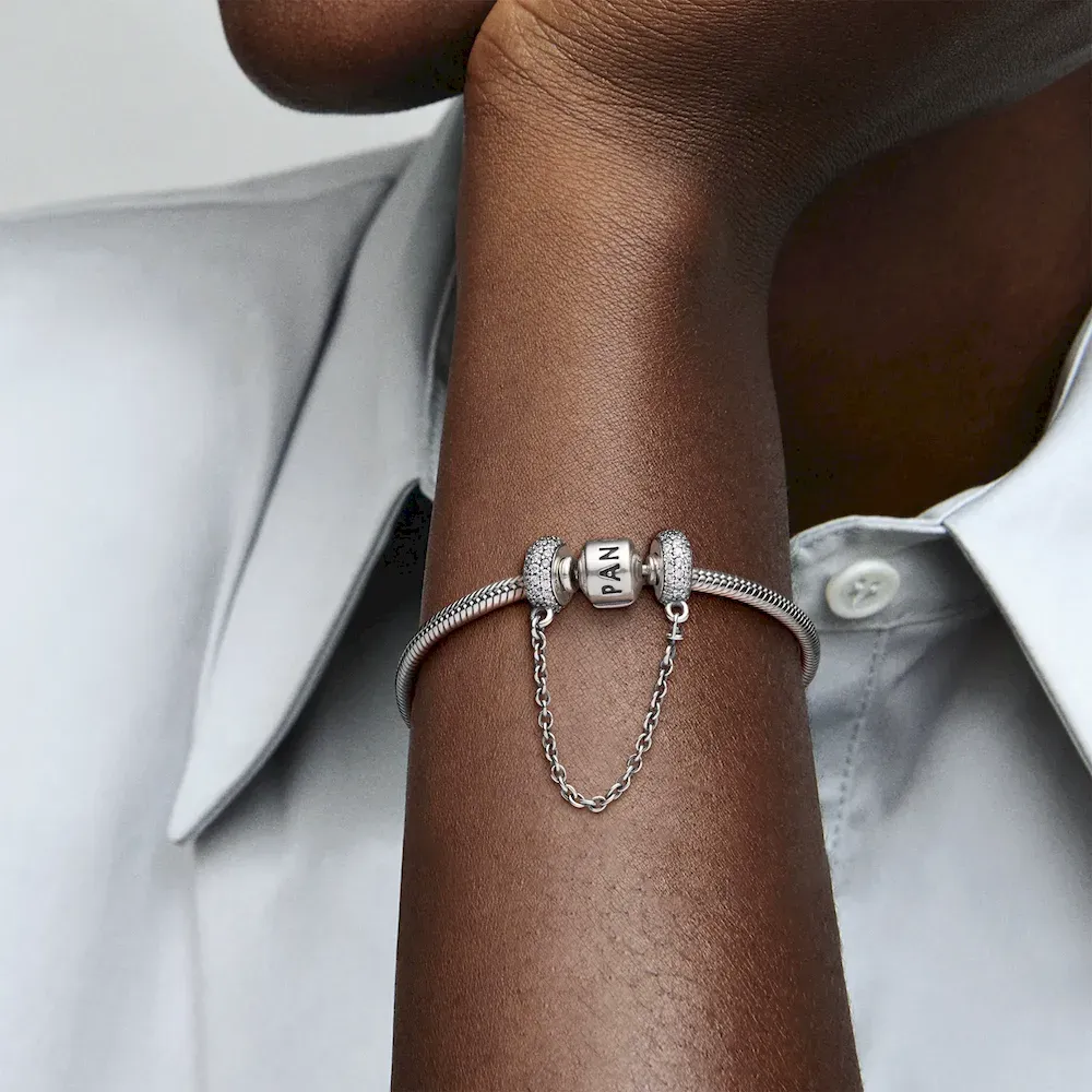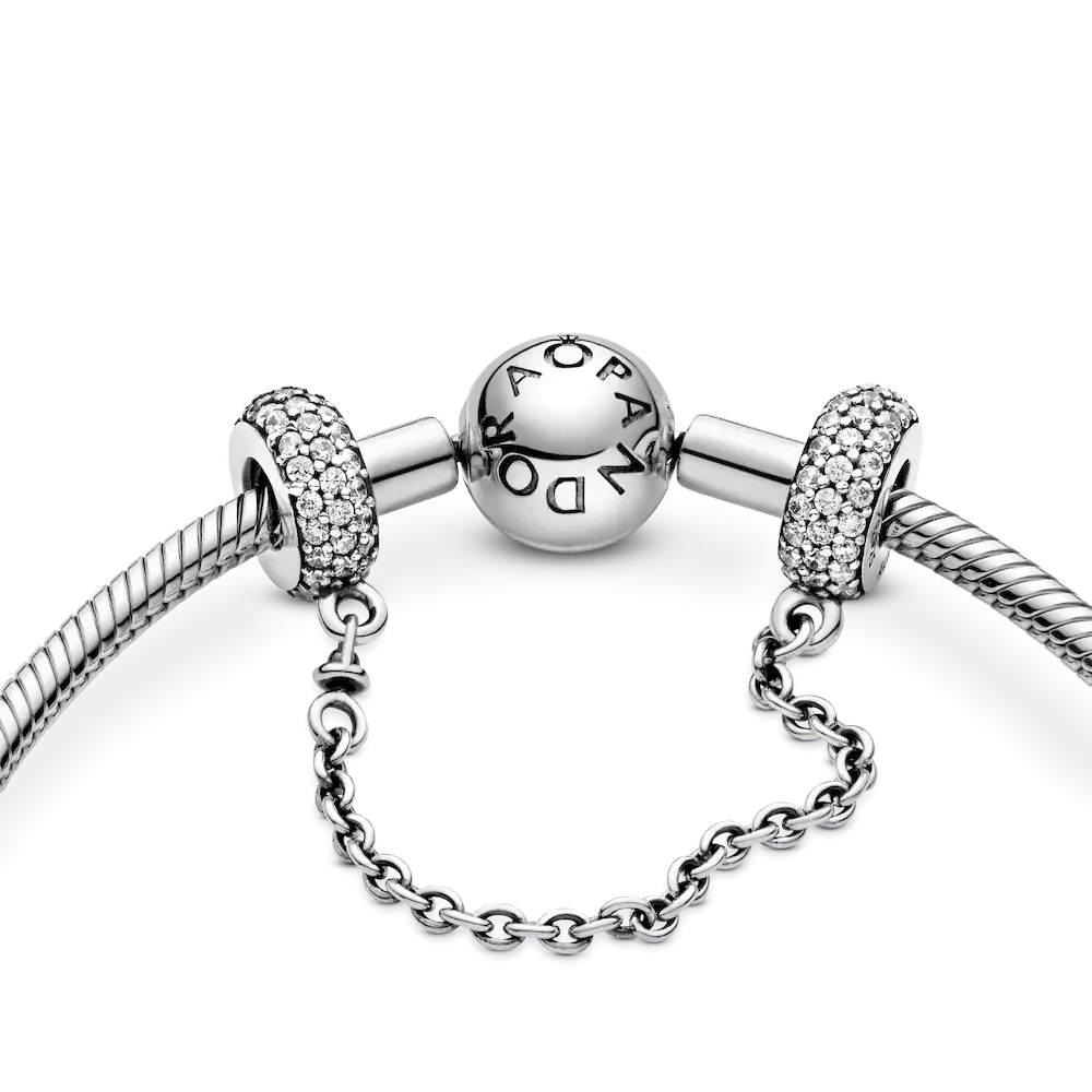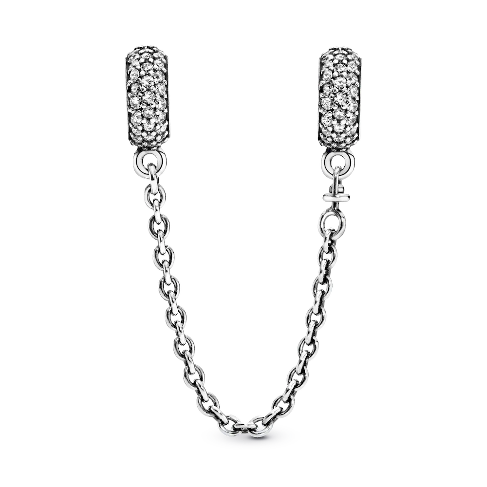 You’ve collected the charms that celebrate your memories and mark your milestones, now keep them safe on your Pandora Moments bracelet with this sterling silver safety chain charm. Accented with cubic zirconia for a sparkling finish, it’s decorative in its own right, and fitted with a swivel chain for tangle-free styling.
