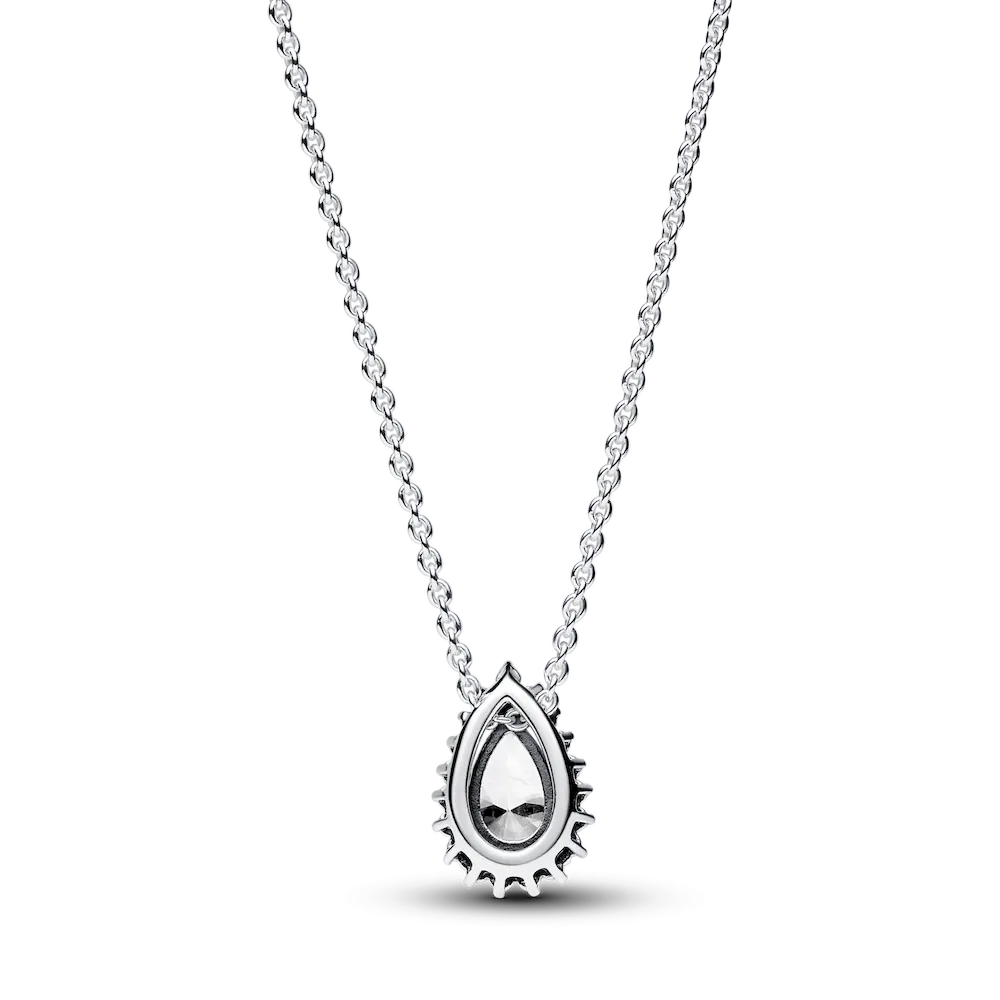 Shine bright every day with the Sparkling Pear Halo Collier Necklace. This sterling silver necklace combines the reimagined pear shape with an iconic element of the Pandora Timeless collection: the pavé halo. The stone of the pendant is set with one V-shaped and two elongated prongs to emphasize the shape, offering a beautiful play on dimension. The pear-shaped pendant slides freely on the chain and can be adjusted in length. A shining statement on its own or beautiful layered with other chains, this pendant effortlessly combines sparkling stones with timeless design.