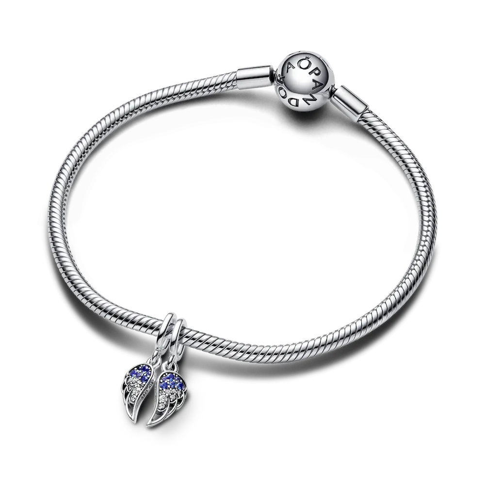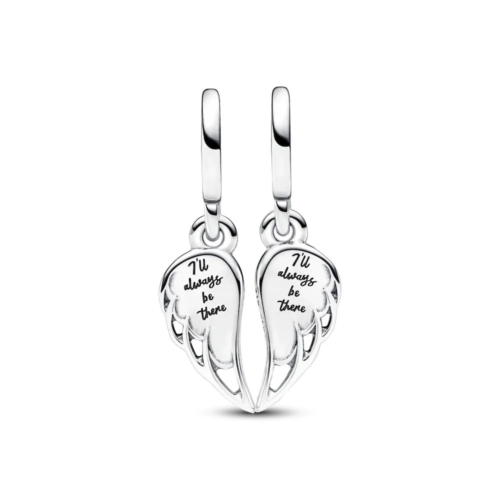 Our Sparkling Splittable Angel Wings Dangle Charm uplifts and inspires. Designed for sharing, these sterling silver charms offer a touching tribute to your own angels. Set with clear cubic zirconia and stellar blue man-made crystals, this angel wings charm features the engraved message “I’ll always be there” on the back of each wing. One for you and one for someone you love, wear these dangle charms to honor the ones who matter most.