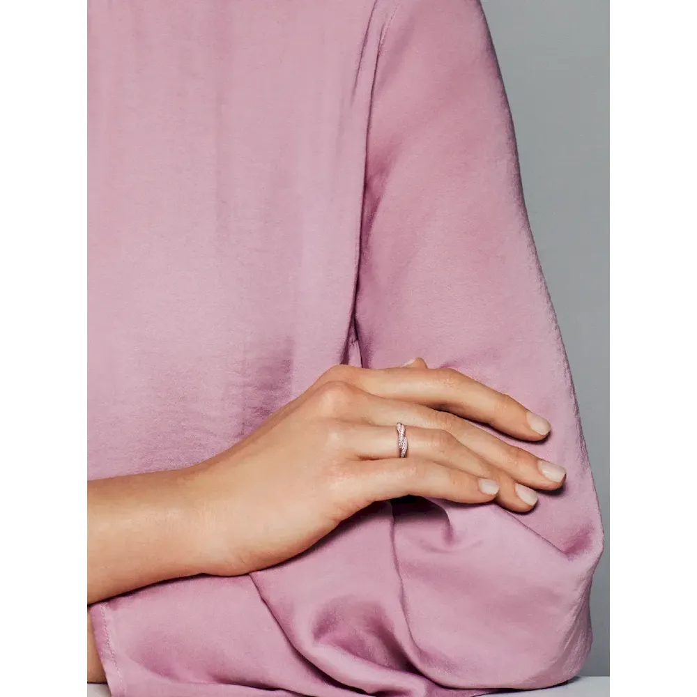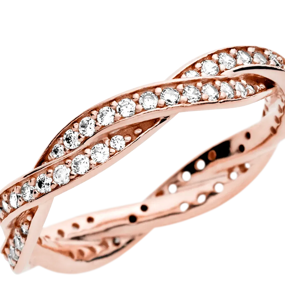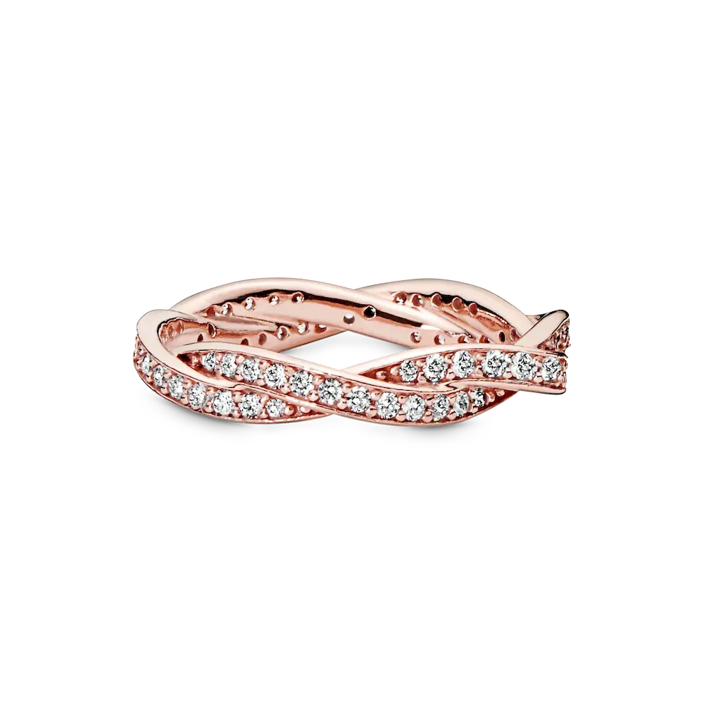 Add contemporary allure to your look with this Sparkling Twisted Lines Ring, plated with 14k rose gold. The delicate, double-layered design is adorned with entwined lines of cubic zirconia stones that shimmer and shine as they catch the light. Wear it on its own or pile on Pandora rings in contrasting tones to create a stunning statement stack.