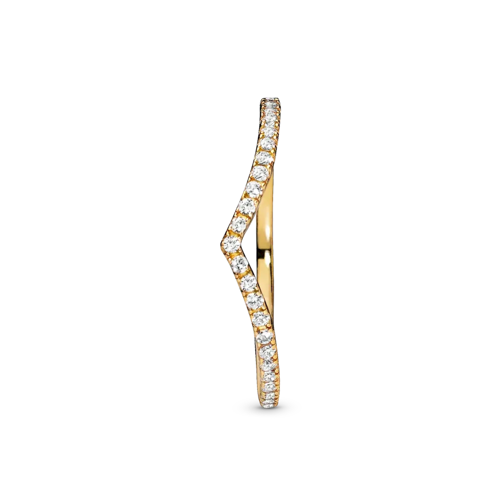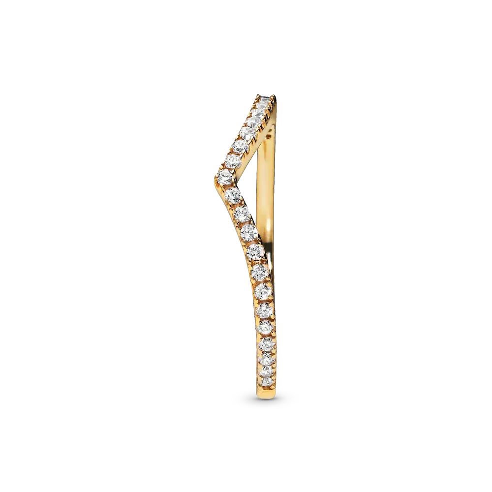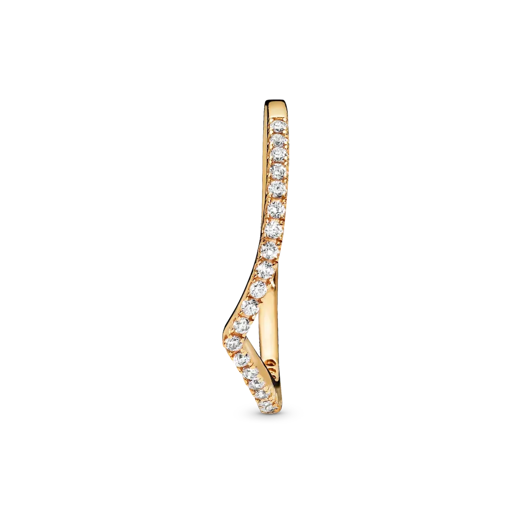 Our popular wishbone style gets a sparkly upgrade with the Sparkling Wishbone Ring in a 14k gold plated finish, featuring 25 brilliant cut cubic zirconia stones set on the ring. Made with smooth and sparkling surfaces in golden hues, the versatile ring is distinctive with its wishbone shape and sparkly look. Perfect on its own, the wishbone shape also lends itself particularly well to layering with other rings in the same or contrasting metal finishes to create an individual look.